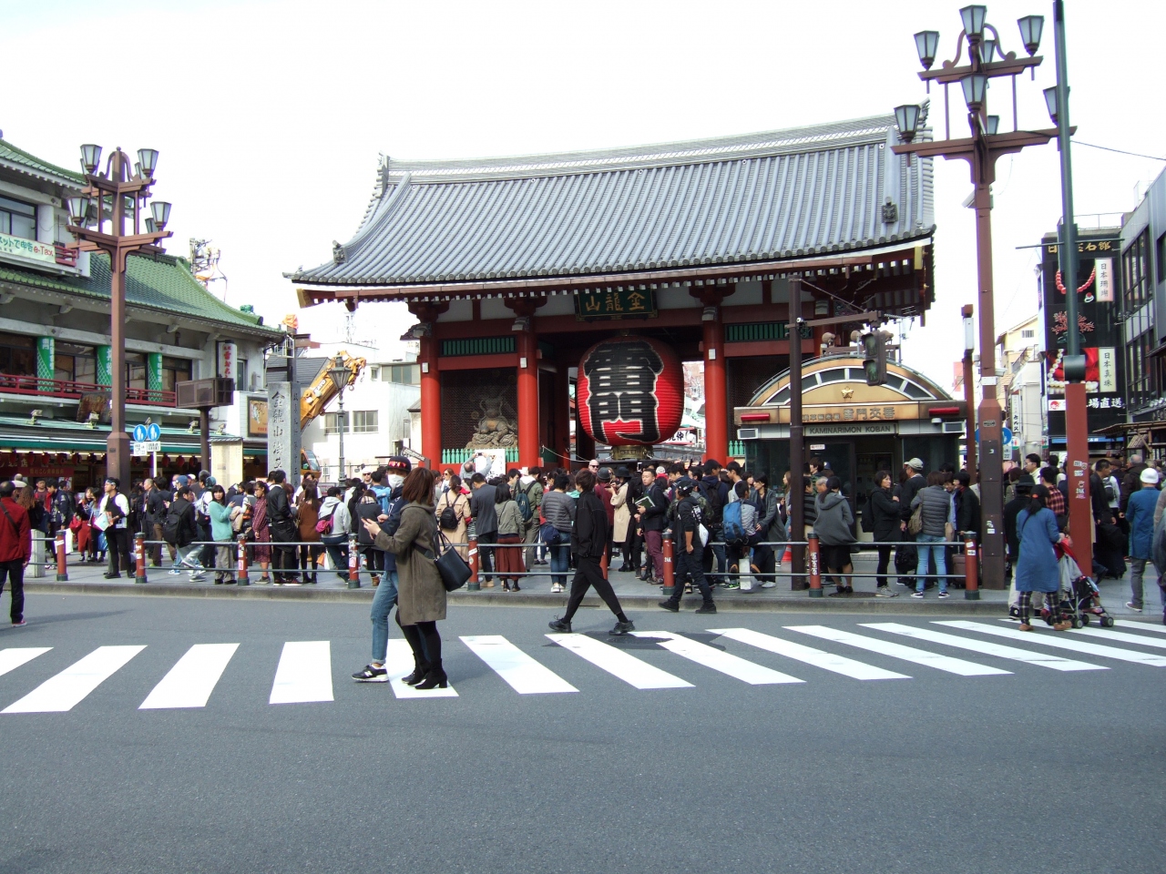 浅草寺の山門としてそびえたつ浅草雷門。浅草を代表するスポットですが、久しぶりに行くとたくさんの観光客でにぎわっていて、近づくのも大変。歩道も狭いので立ち止まって記念撮影されると大変です。よく見ると提灯は松下電器の寄進で、社名が書かれています。
