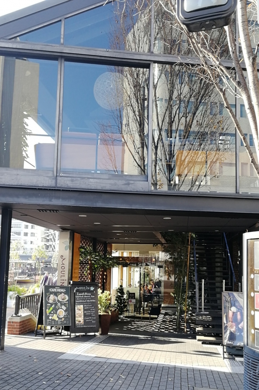 湊町リバープレイスを川越しに見る、道頓堀沿いにあるムーランは明るい光の差し込む店内が素敵なカフェです。