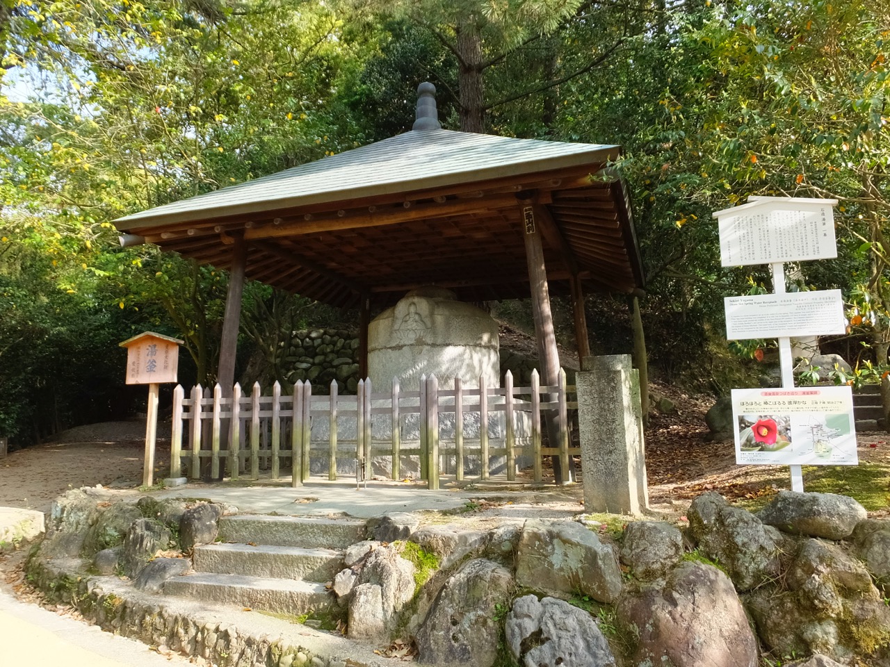 道後温泉の湯釜は現役の浴場で使用されているもの以外に、過去に使用されていたものとして、駅前の足湯に使われているものもありますが、それ以前、1000年以上前から使われていたと言われるものが道後温泉の手前の道後公園の中に展示されています。足湯のところのものより大きく感じます。湯釜薬師、という立て札が横にあったので、神様扱いのようです。ただ、温泉街から歩いて見にきてもあまり感動はないと思いますので、時間があれば、といったところでしょうか。