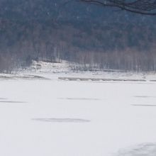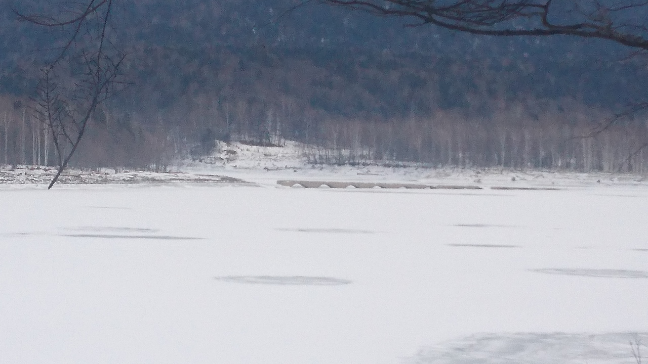 連続したアーチ形の橋を見られると期待して、展望台へ。車を止めて雪の中を180mくらい歩いて展望台へ到着。車は路肩停車。残念ながら水没&雪に埋もれていて、上部の一部しか見られず。季節を変えてリベンジしたい。