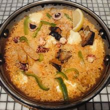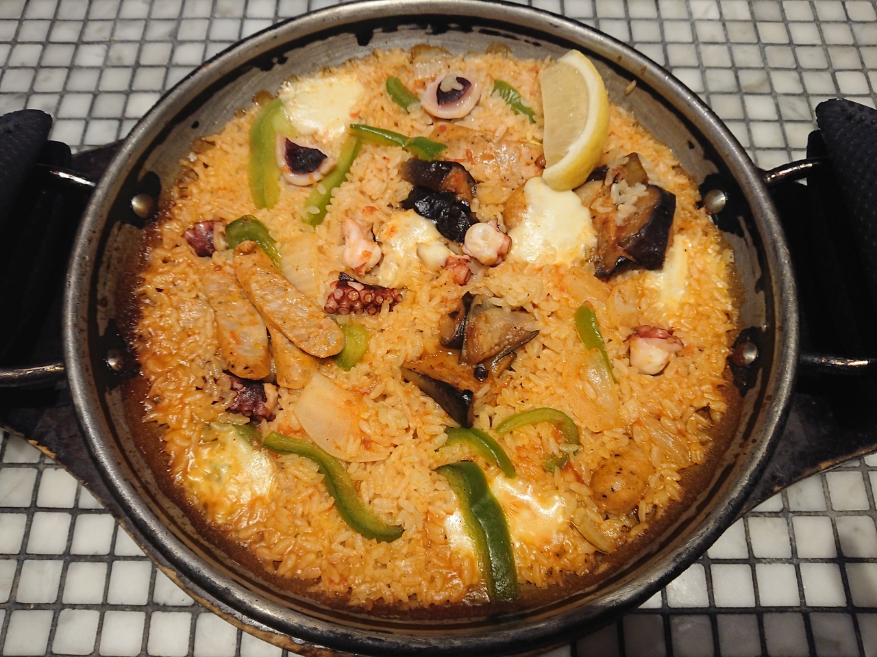 ナスとチョリソーとモッツァレラが乗ったパエリアでしたが・・可もなく不可も無くと言った感じで、味が完全にボヤけてしまっていました。