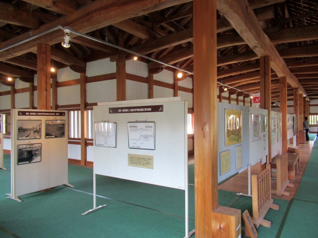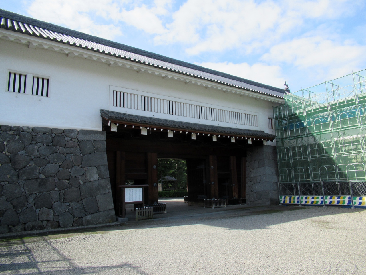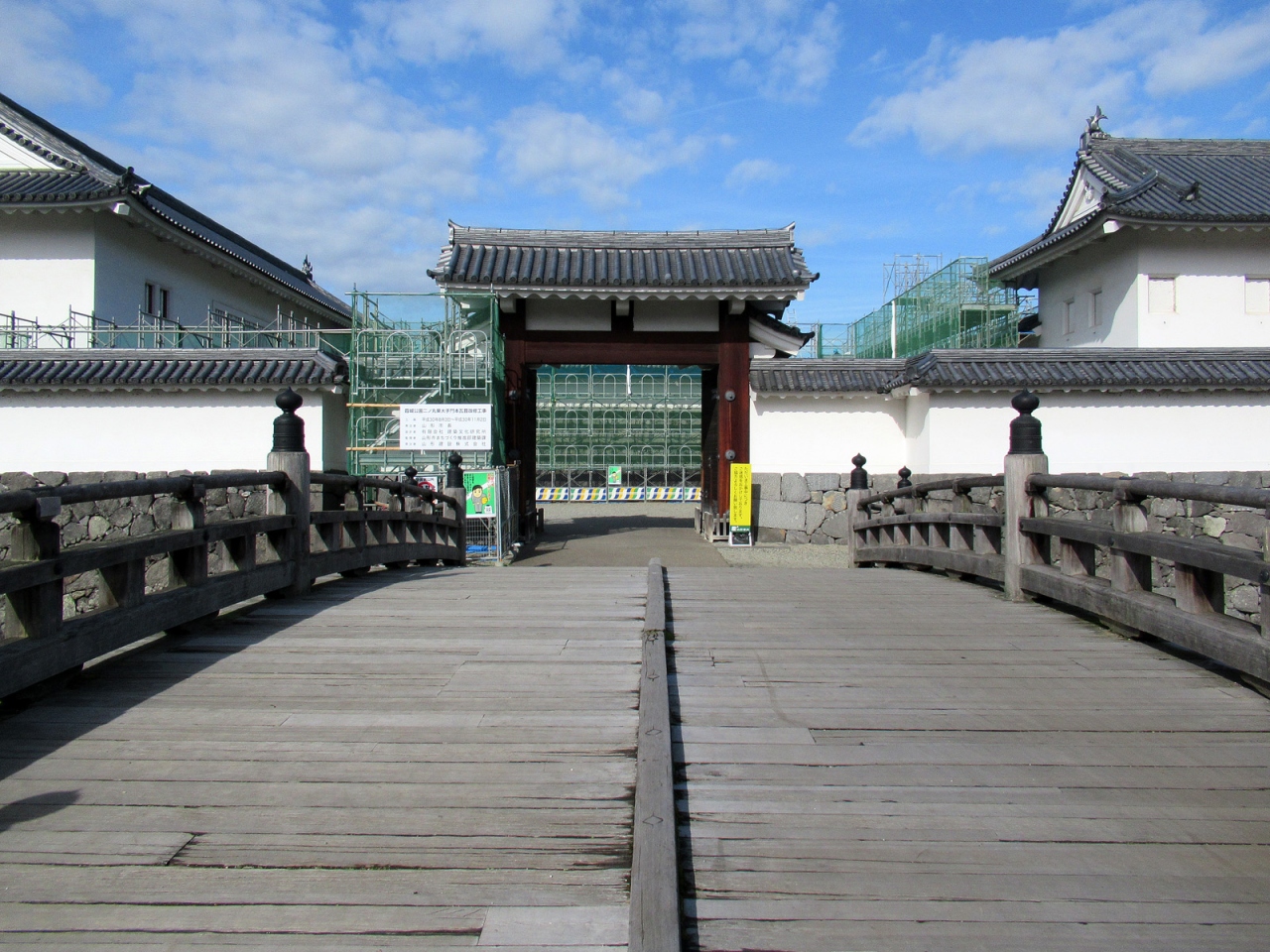 現在、山形城の正門の役割をしている櫓門です。門はもちろん復原されたものですが、造りは確かです。訪れた時には高麗門脇塀や桝形部土塀などの修繕中でしたから、今後がますます楽しみになります。櫓門内部は見学可能で、復原に関する動画や写真パネル、山形市の観光案内ポスターなどがあり、ボランティアガイドの方も見えました。