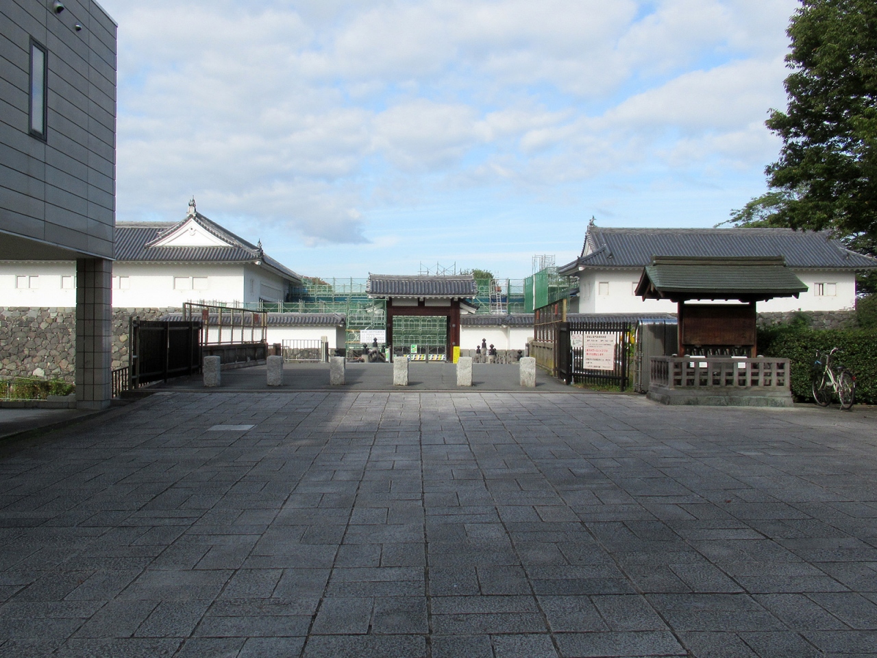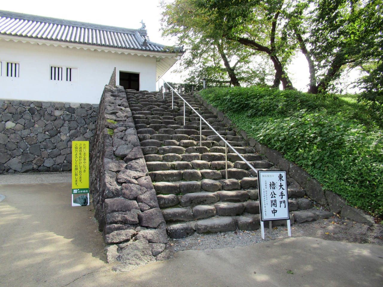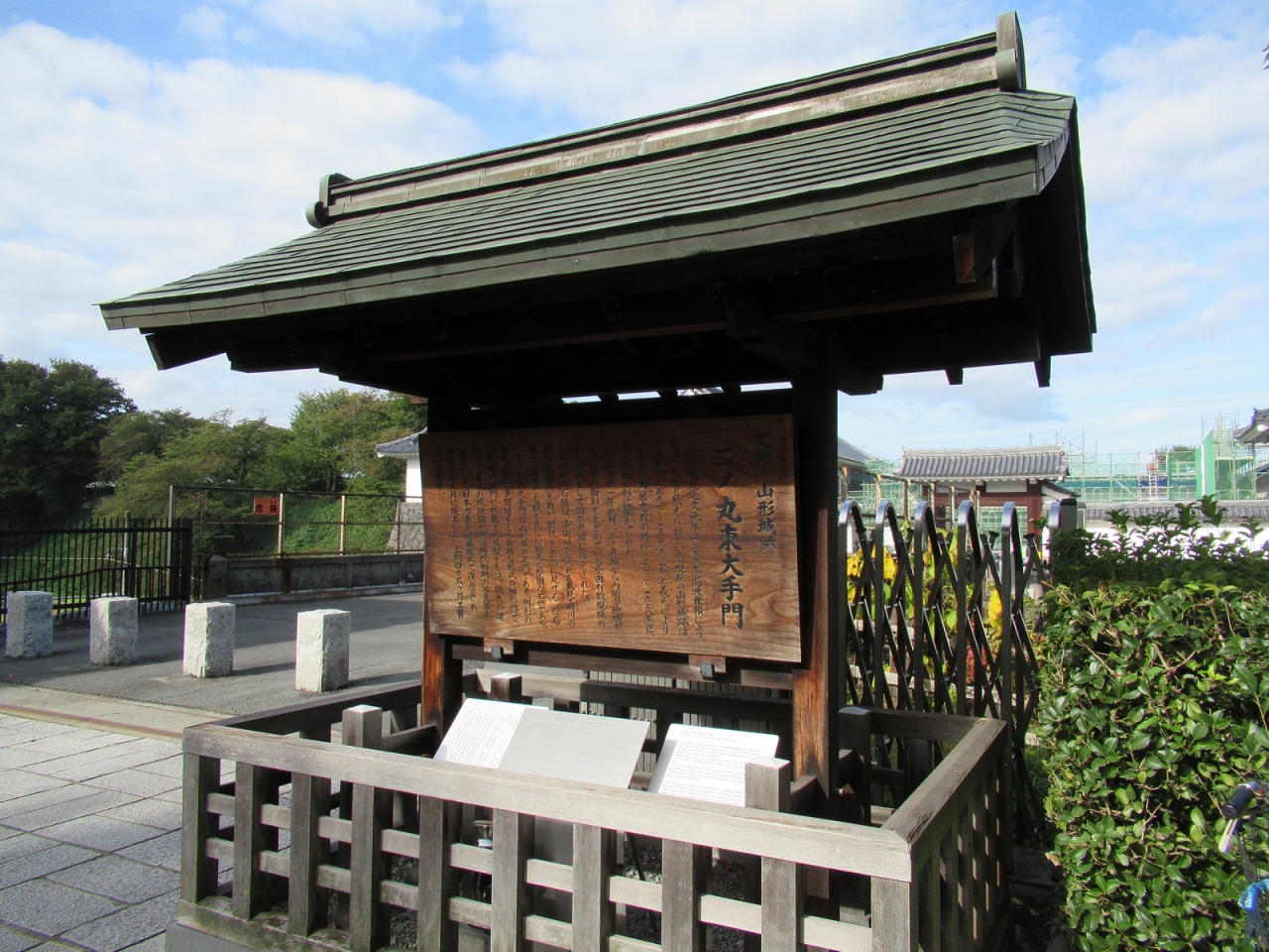 現在、山形城の正門の役割をしている櫓門です。門はもちろん復原されたものですが、造りは確かです。訪れた時には高麗門脇塀や桝形部土塀などの修繕中でしたから、今後がますます楽しみになります。櫓門内部は見学可能で、復原に関する動画や写真パネル、山形市の観光案内ポスターなどがあり、ボランティアガイドの方も見えました。