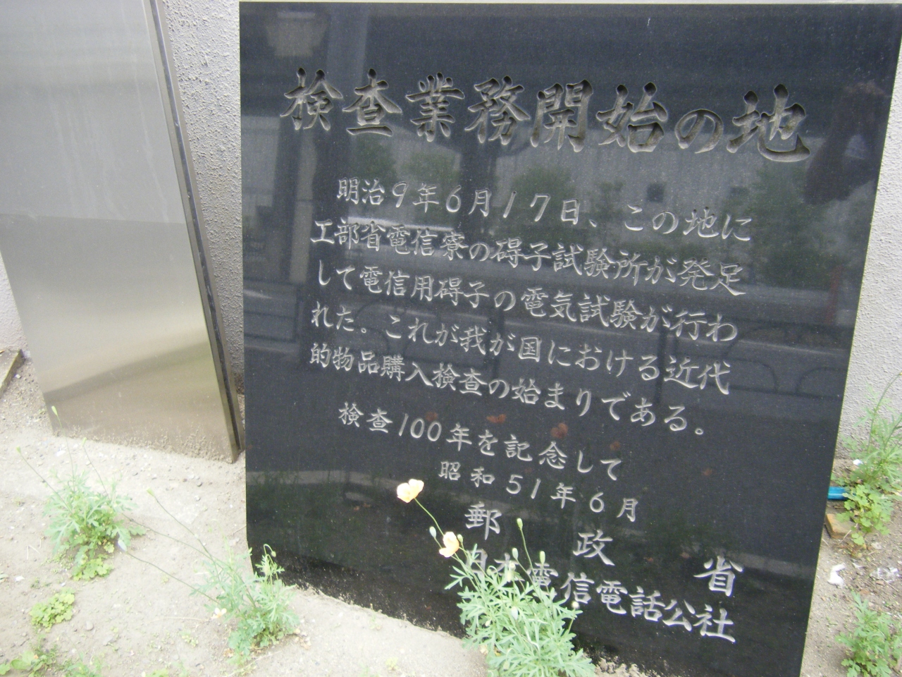 都営大江戸線築地市場駅から徒歩10分ほど(汐留駅の方が近かったです。汐留駅からなら数分で着くと思います)の銀座郵便局前に「検査業務開始の地」碑はありました。碑文には「明治9年6月17日に、この地に工部省電信寮硝子の電子試験所が発足して、電信用硝子の電気試験が行われ、この試験が我が国の近代的物品購入検査の始まり」と書かれていました。電気試験とはどういった試験をやったのですかね。せっかくならもう少し詳しく書いてくれるとよかったのに、と思いました。