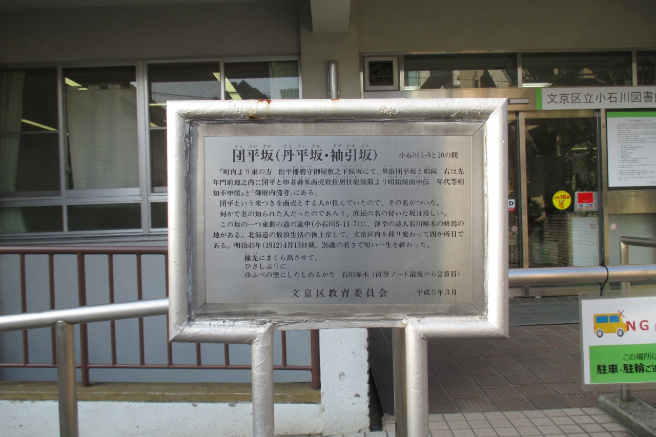 団平坂は、小石川図書館の前や文京区立竹早公園(竹早小学校(竹早国民学校)跡の案内が立っています)の前を通っている、狭い坂道でした。名前の由来は、団平という米つきを商売とする人が住んでいたので団平坂という名前がついたと書かれていました。米つきとは今でいえば精米のことですから、白米を食べる様な高級住宅がご近所に多かったのでしょうかね。近くに松平家の大名屋敷はあったそうですが・・・。