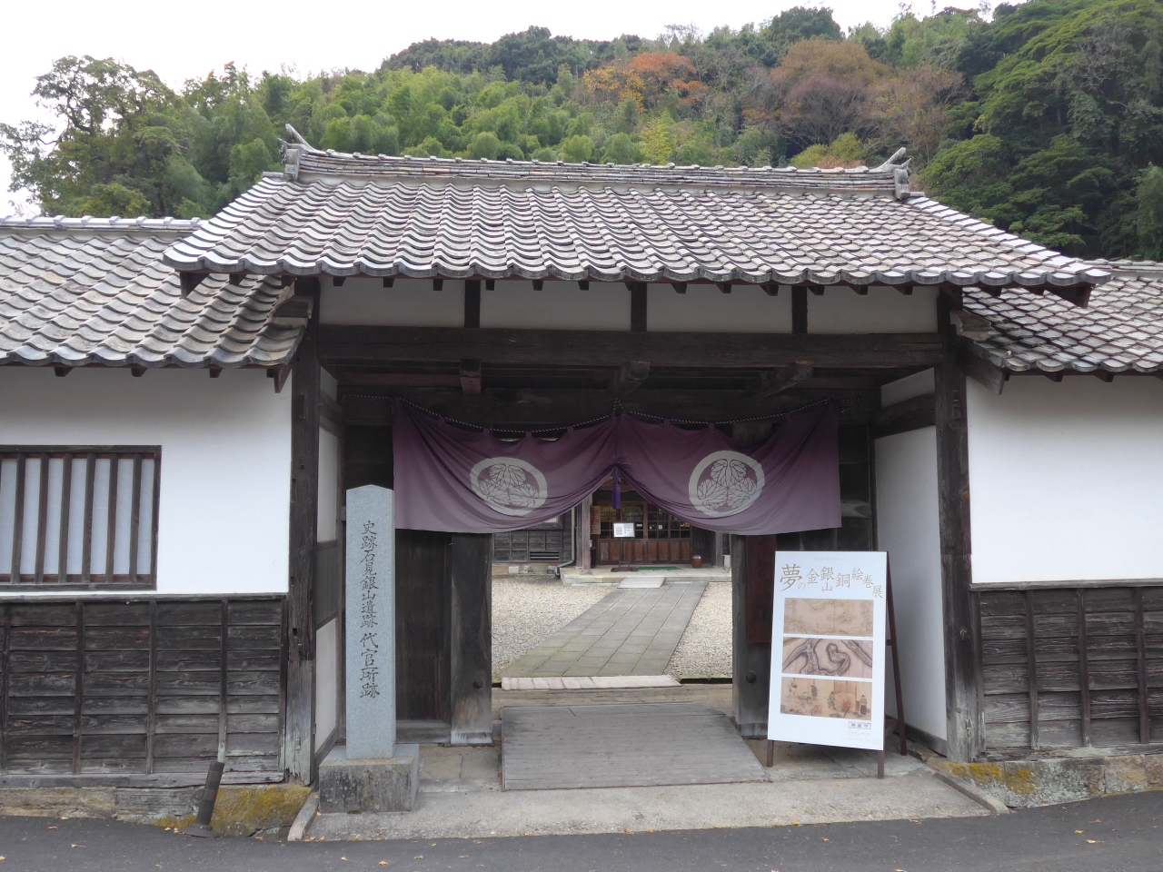 白壁作りの建物に入り口の門がありその横に「史跡石見銀山遺跡・代官所跡」の石碑が建てられています。
