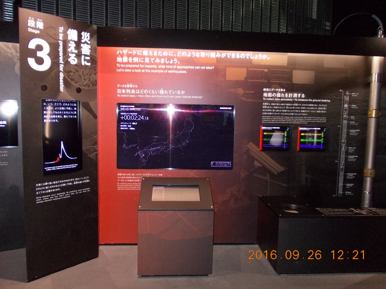 実物大の地震計や現在の地震活動などを見ることができる。また、他の防災対策などについても開設されていた。また、病気に対する備えなどの展示もある、エネルギーの量がボールの量で表され、ボールの流れによってエネルギーがどのように消費されているかを実感できる、また、宇宙ステーションにある日本の実験棟きぼうの実物大の空間も再現されており、宇宙ステーションの様子を実感できる。