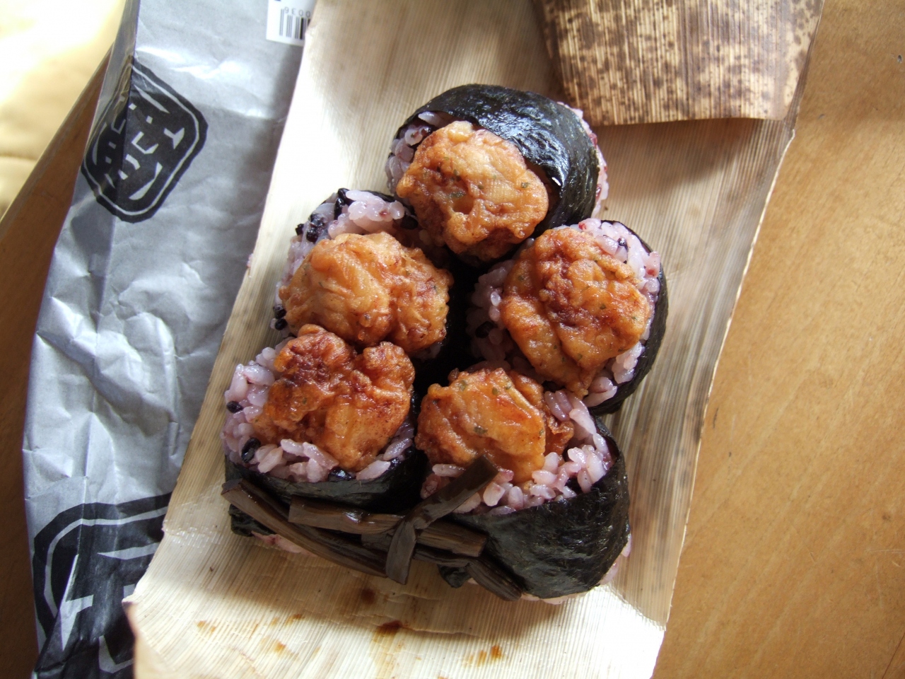 赤米の天むすを買ってみましたが、もちもちのご飯の中に、甘めの醤油だれで味付けした海老天が入っています。二口くらいで食べられるので、乗り物の中で食べるにも手ごろです。