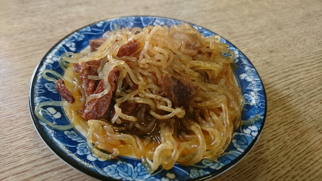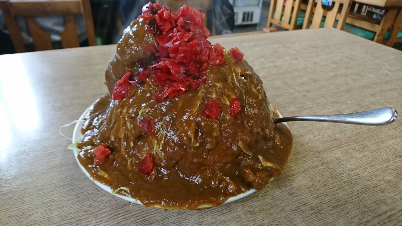 柏崎市の郊外にあるお店。車でないと行くのは難しい場所にある。柏崎ICから10分くらい。お店の外見は、道路沿いにある食堂そのもの。メニューを見る限り、いろいろなメニューのある食堂といった感じですが、しかし、提供されたものを見れば、このお店のすごさがわかる。お兄さんが目の前で食べているすごい量の普通盛りのカツ丼や肉丼もひかれましたが、やはりここはカツカレーを注文。「カツを揚げるので20分くらいかかります」とのこと。最初にサービスの一品(糸こんにゃくとお肉の煮物)が出てくる。温かいので寒い新潟向きの味。やって来たカツカレーは、これで本当に普通盛り?と思う量。お店の方から「ラーメン屋のカツカレー普通盛りです」と言われて提供。見た目もすごいが、カツの厚さも衝撃的。カレールーは家庭の味。もちろん、常人には食べ切れない。300円プラスで大盛もあるようですが、これはよほどの大食いの方でないと無理かと。日本テレビ「月曜から夜ふかし」、TBS「ニュースキャスター」、テレビ東京「ありえへん世界」をはじめ全国、ローカルテレビでも多数取り上げられており、デカ盛りの聖地化している。しかも、出前もやっています。