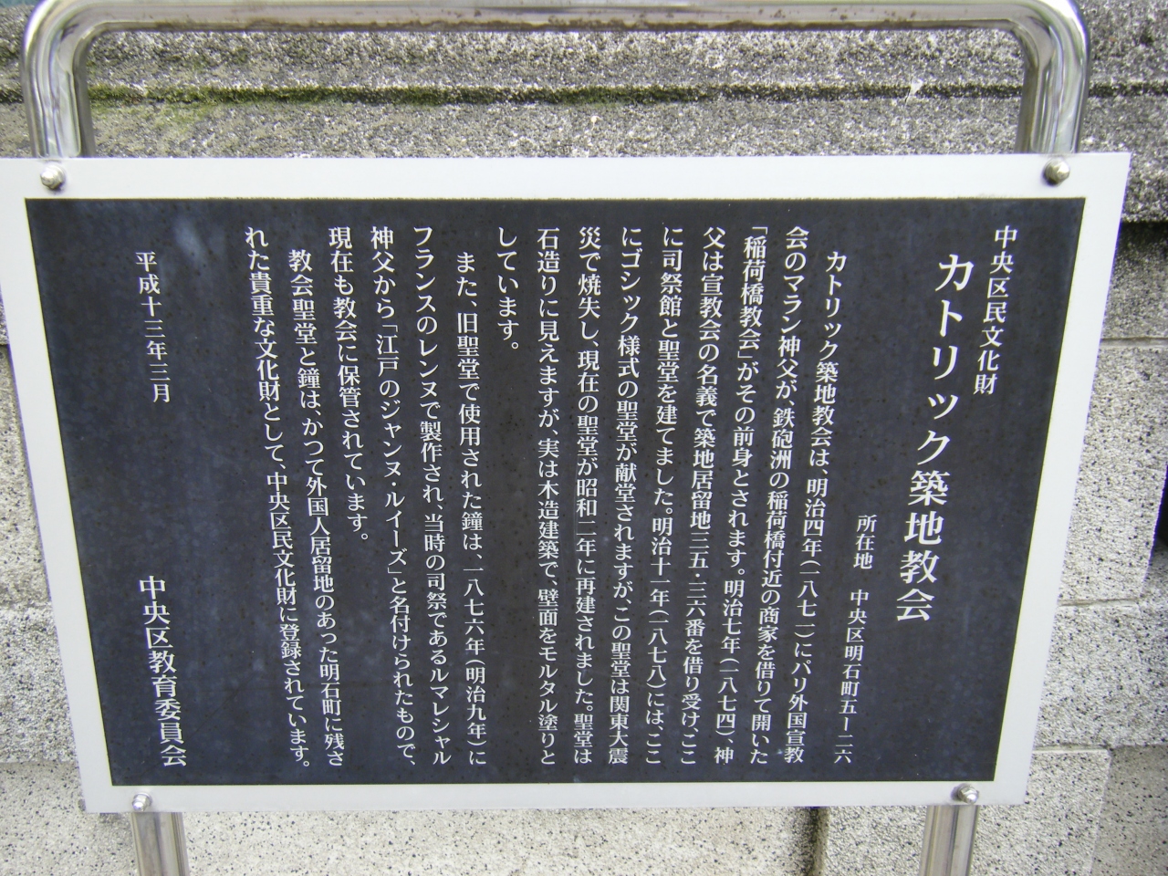 築地の北東にあります区立明石小学校の目の間にある教会です。この周辺は幕末のころ、築地居留地と呼ばれる外国人が集まっている場所であったため、教会などもあるのでしょうね。こちらの教会、外見がなかなかオシャレで、教会というよりもギリシャの神殿のような作りをしております。以前の建物は関東大震災で焼失し、昭和2年に再建されたものが現在も残っているそうで、100年以上の歴史があることに驚きました。