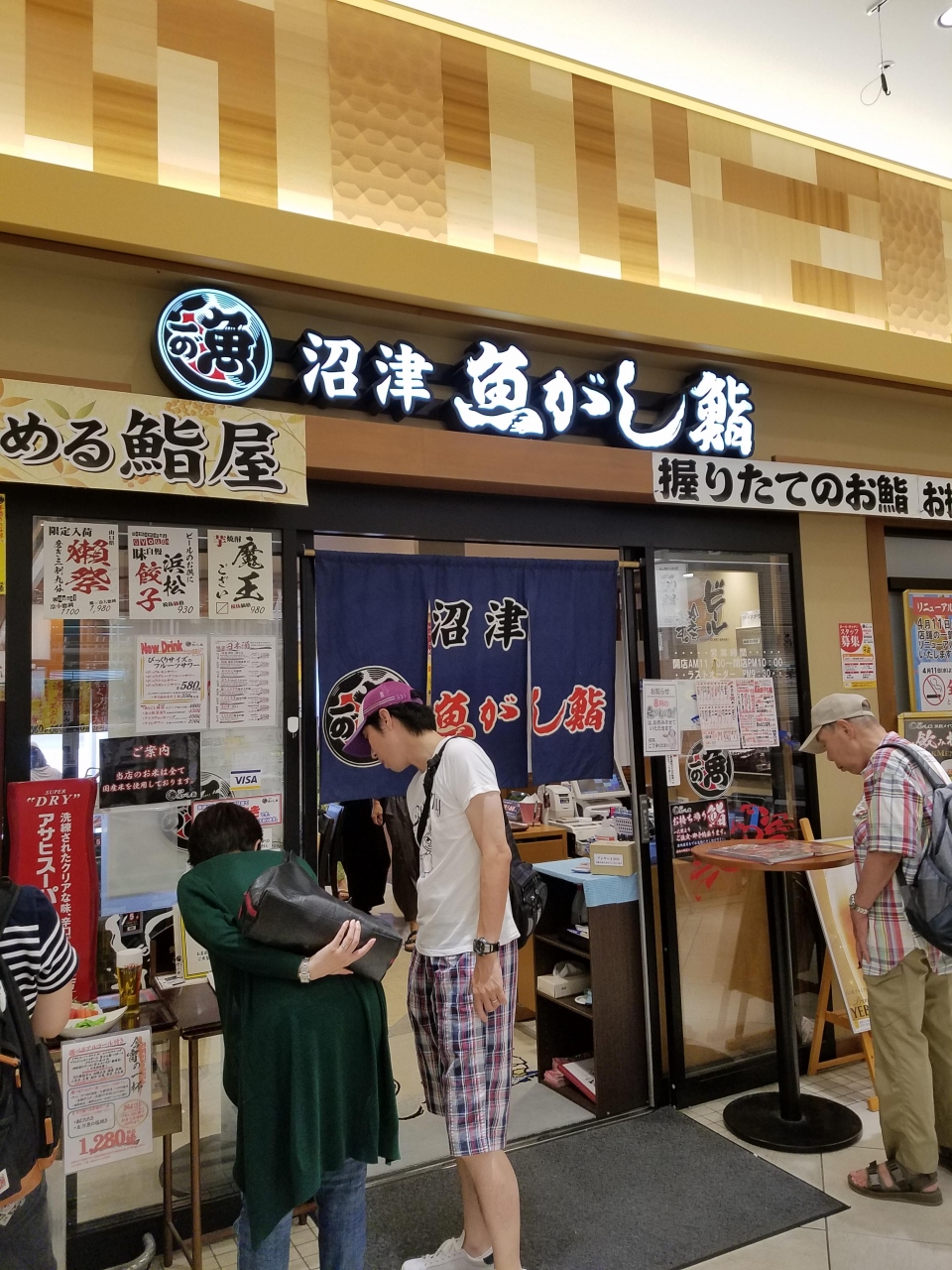 沼津魚がし鮨は、その名の通り沼津港で水揚げされる新鮮素材をお手軽値段で提供するお店でJR駅構内に数多く出店しています。浜松駅も駅直結のモール「メイワン」内の飲食店エリアにあります。定番のマグロをはじめサーモンなどお好みチョイスでお酒とともにいただきました。