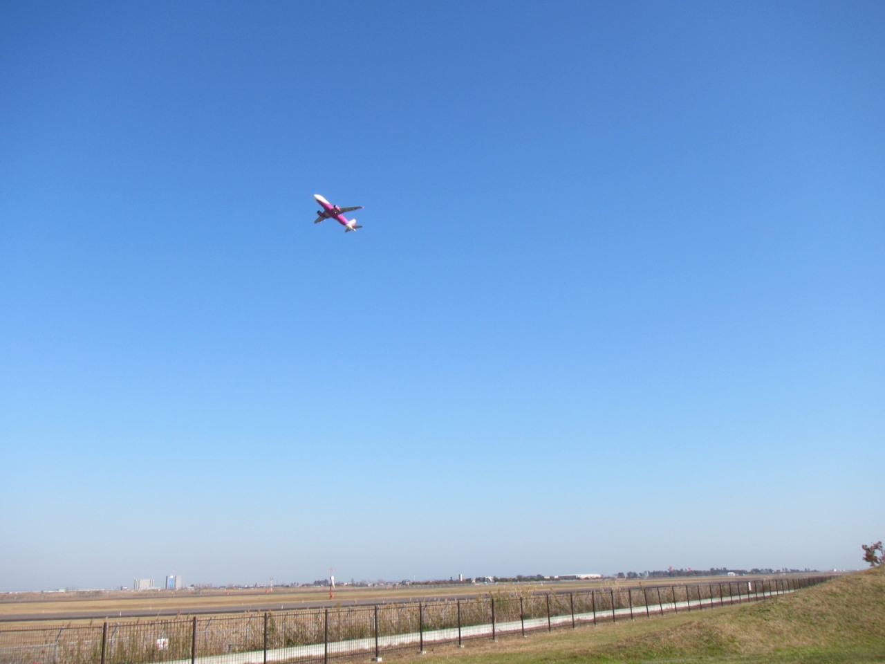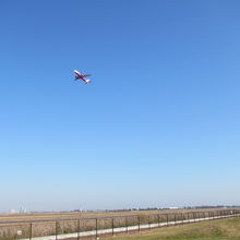 滑走路の先端付近にあり、ちょうど飛び立っていく飛行機の腹が見えました。