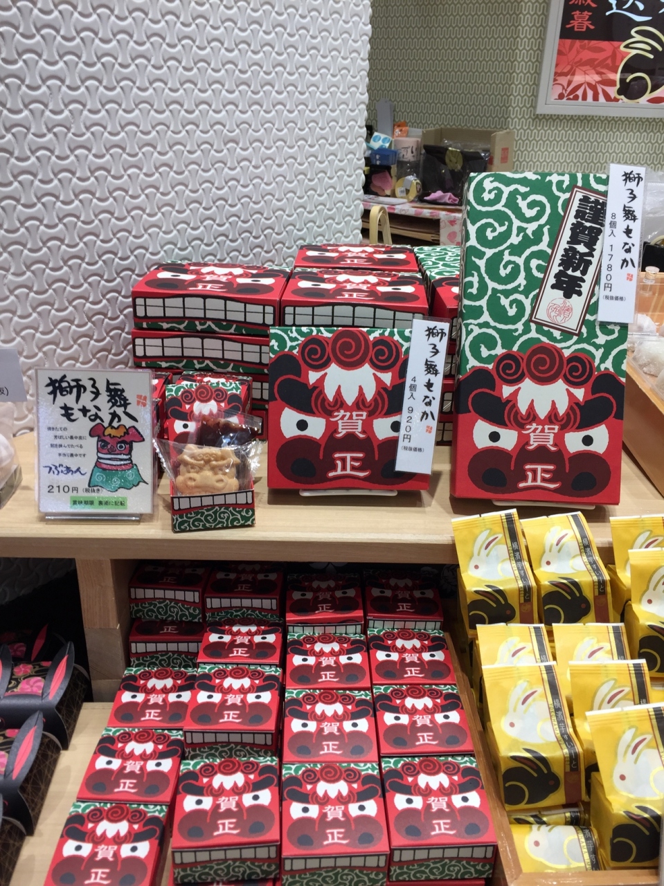 ウィング川崎の1階にある濱うさぎさんです。新年のお持たせに何か探していたら、獅子舞モナカというお菓子を発見しました。忠実な獅子舞の顔のモナカと餡が別々に入ってました。餡の量を自分好みに調整出来ますね。パッケージにも獅子舞がプリントされていて いかにもお正月っぽいです。