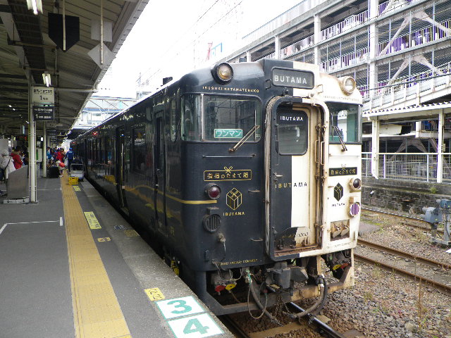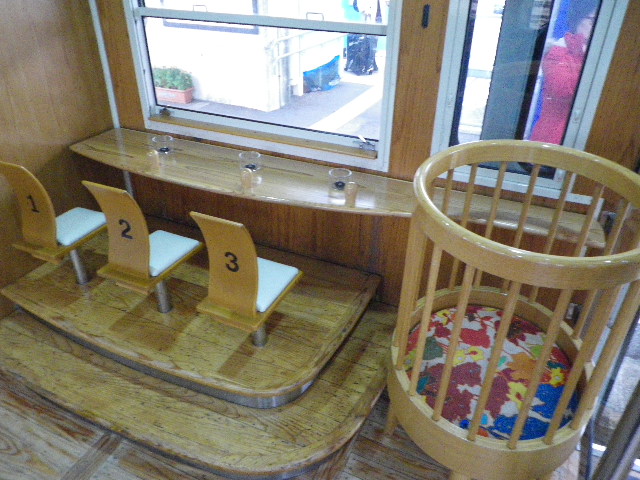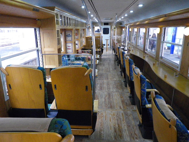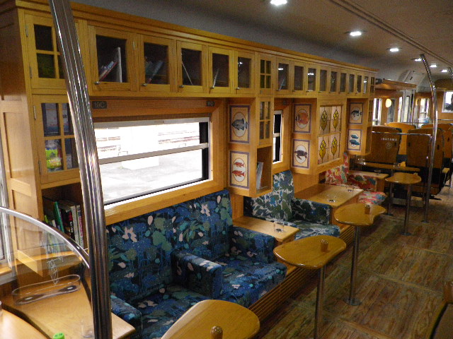 極上の列車旅は揺れて揺れて猛スピードで指宿へ。ゆっくり駅弁を食べて食後のスイーツにいぶたまプリンと指宿温泉サイダーでのんびり錦江湾を眺めながら景色を楽しみたかったのですが残念。ソファで絵本は読めるの?。車内では車掌帽子をかぶって電車パネルと記念撮り、絵葉書スタンプサービスあり。指宿駅付近では市役所の方が黄色い旗を振ってくれました。きれいな車内でいろんなバリエーションの椅子があるのにもったいない。