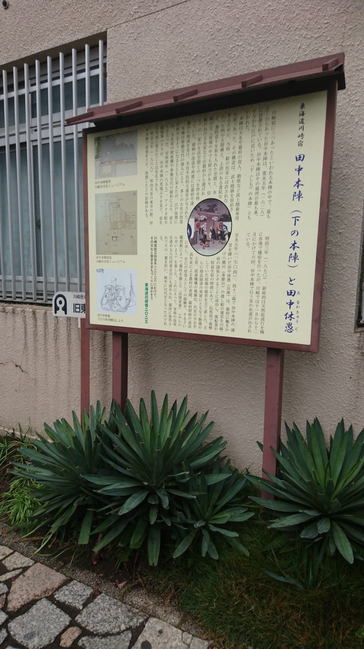 川崎宿にある三つの本陣の一つである田中本陣があった場所に行きました。京急川崎駅から六郷橋方面に歩いた場所にあり、現在は説明板があるだけでした。最も江戸に近いため「下の本陣」とも呼ばれており、主人の田中休愚は、本陣、名主、問屋の三役を兼務して幕府の勘定支配格に登用されるほどの人だったそうです。
