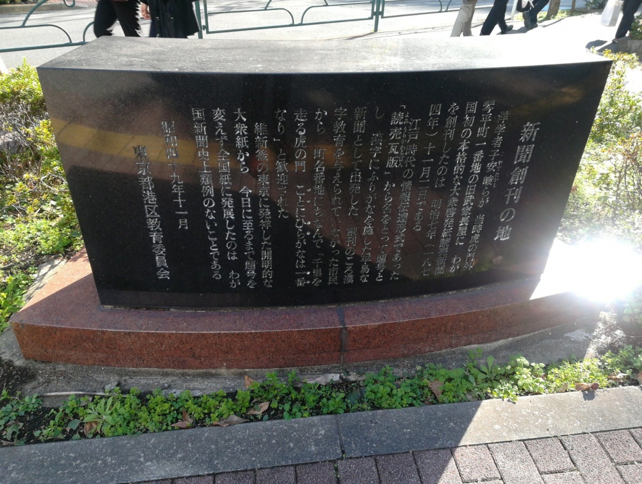 外堀通りが虎ノ門交差点でカーブする外周部分に黒い石碑が建っていました。ただ、あまり背の高いものではなく目立ちませんので訪れる方はご注意を。ここは、明治初期に創刊した読売新聞の発祥の地(創刊時は別名)だそうです。