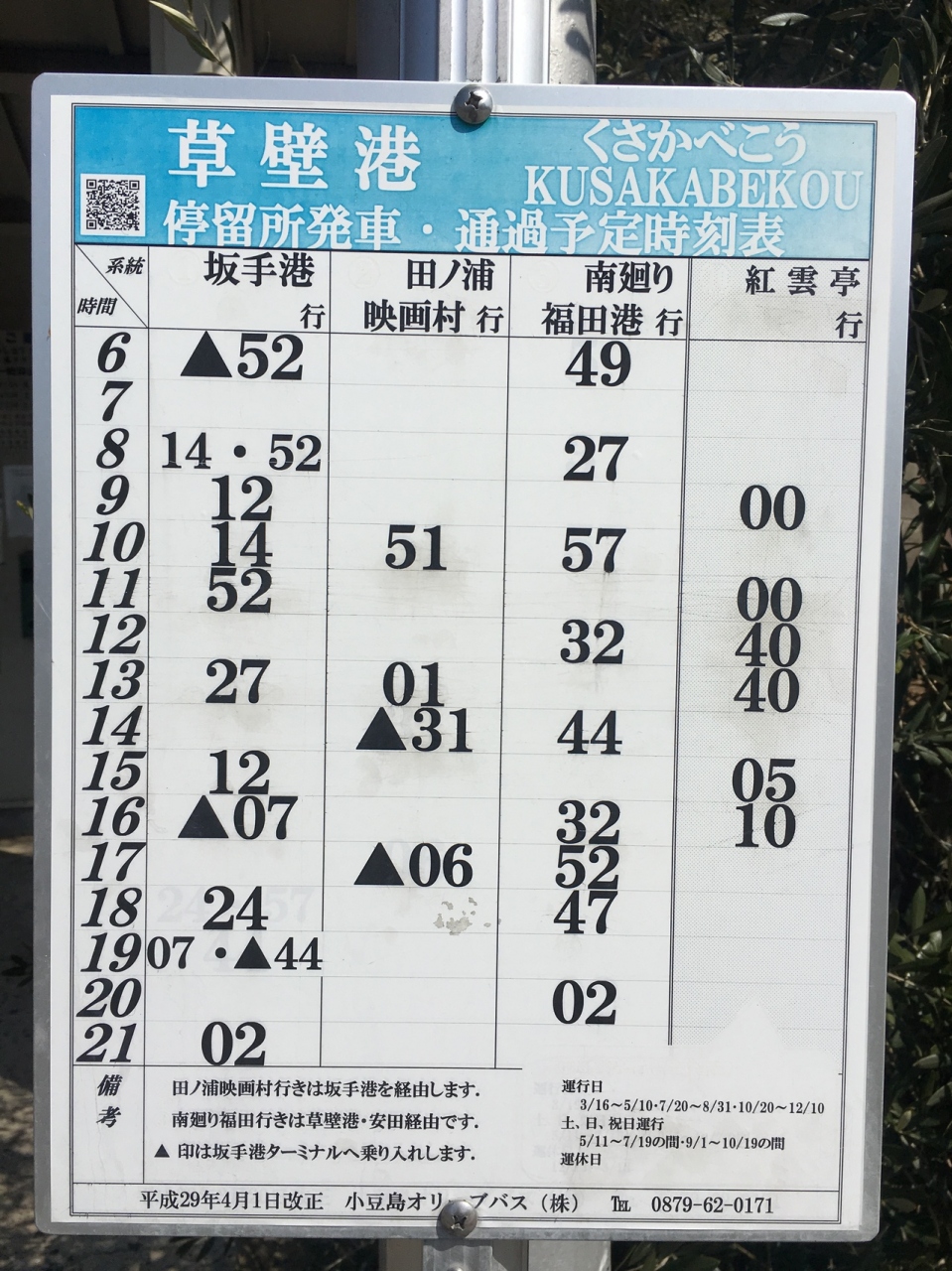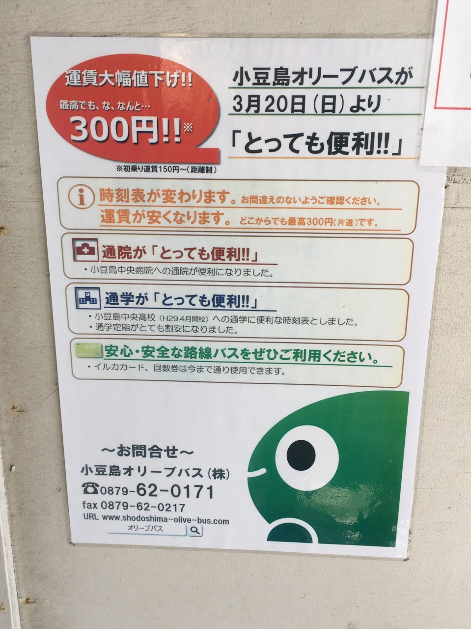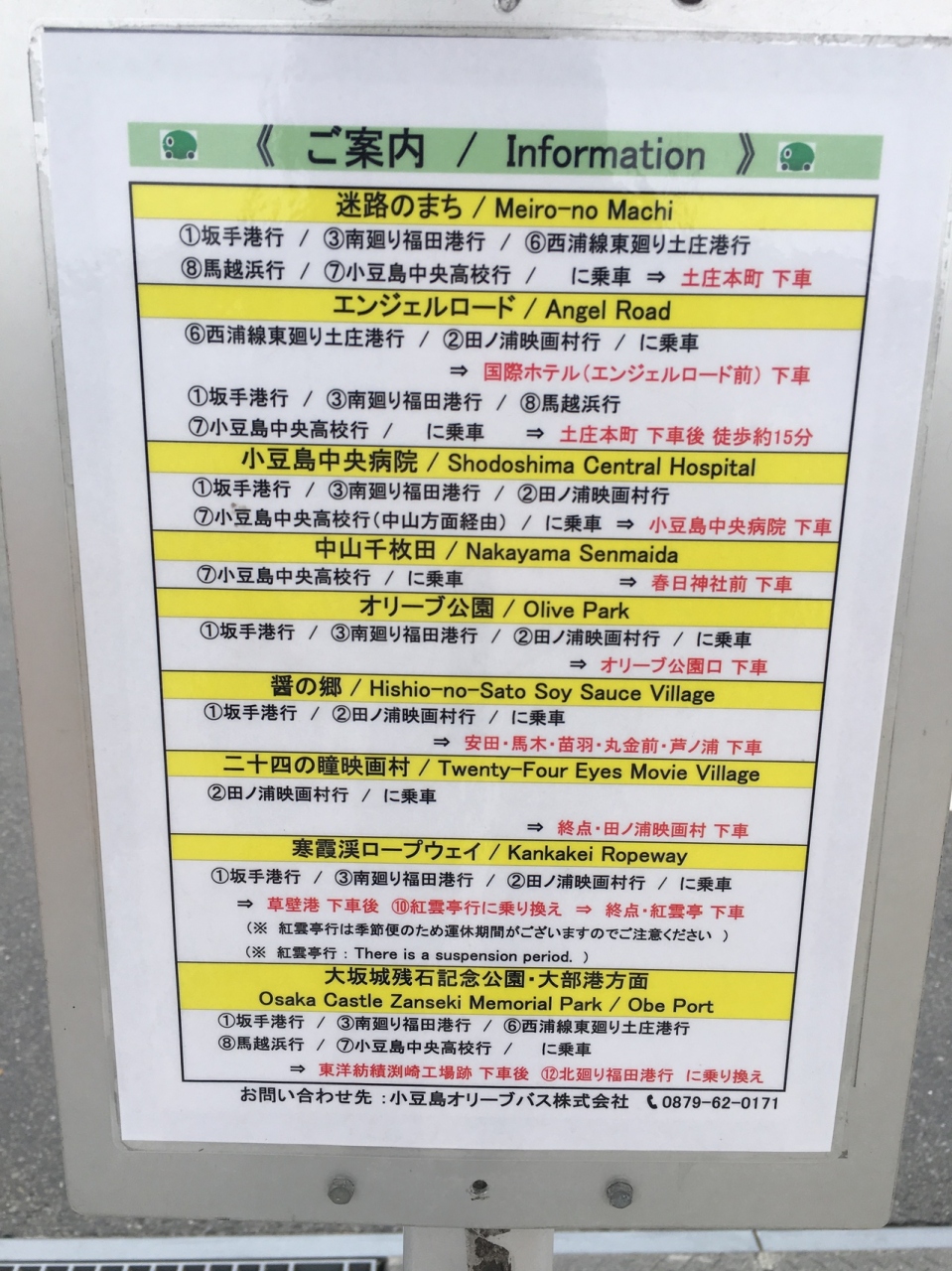 小豆島内唯一の公共交通機関であるバスはオリーブバス号と呼ばれ、いくつもの路線が存在し島内をくまなく走っています。