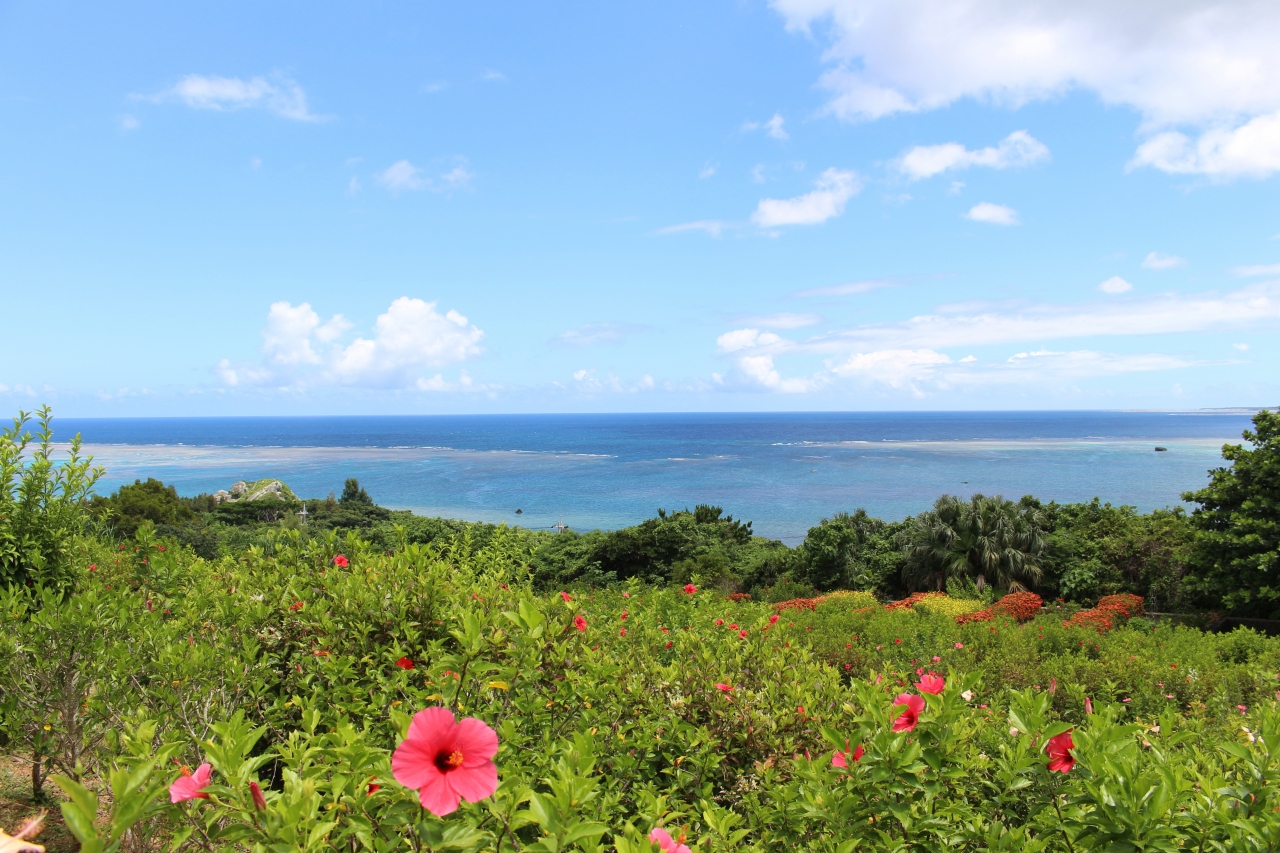 海沿いの幹線道路から脇道に入ってしばらくすると駐車場に到着、そこから坂道を歩いて行くと展望台に到着します。展望台からの眺めもよいですが、そこまでに遊歩道の脇に、きれいな海をバックにきれいに花も咲いていました。空港まで比較的近いので、最後にここで時間調整もできます。