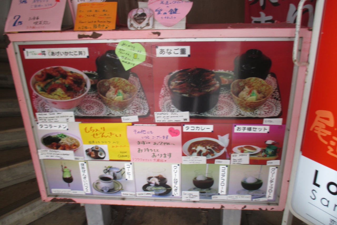 グリル展望は、展望台に上がる途中にありました。狭い入口前にメニューケースが置かれていました。タコラーメンに、タコカレー、そして、あげいかたこ丼です。まさに、たこ、たこ、たこです。ついでの様にあなご重もありました。尾道は瀬戸内の幸が豊富だと思いますが、ここではタコが一押しみたいです。