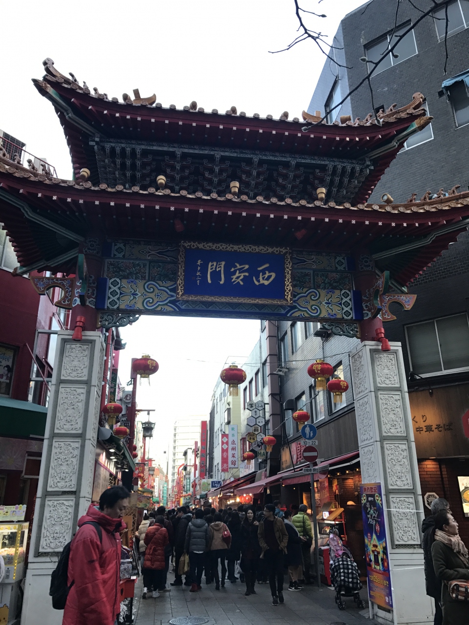 今回は西安門から中華街に入りました。立派な中華風の門で、写真を撮っている人が少しいました。門付近はやっぱりにぎわっています。門の柱のところに、中華街ランタンイベントの張り紙がしてありました。夜になると、ランタンに灯りを灯すらしい。