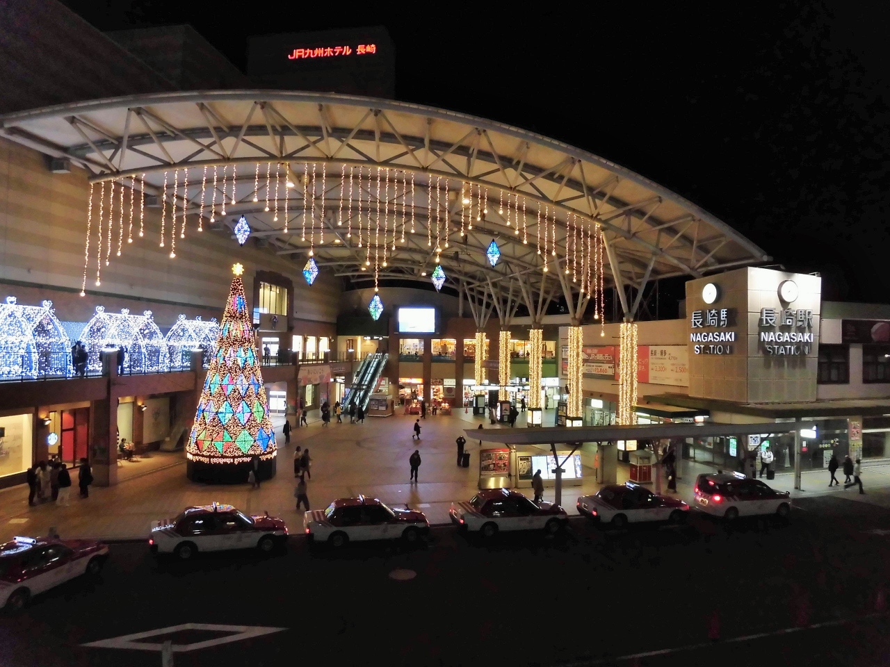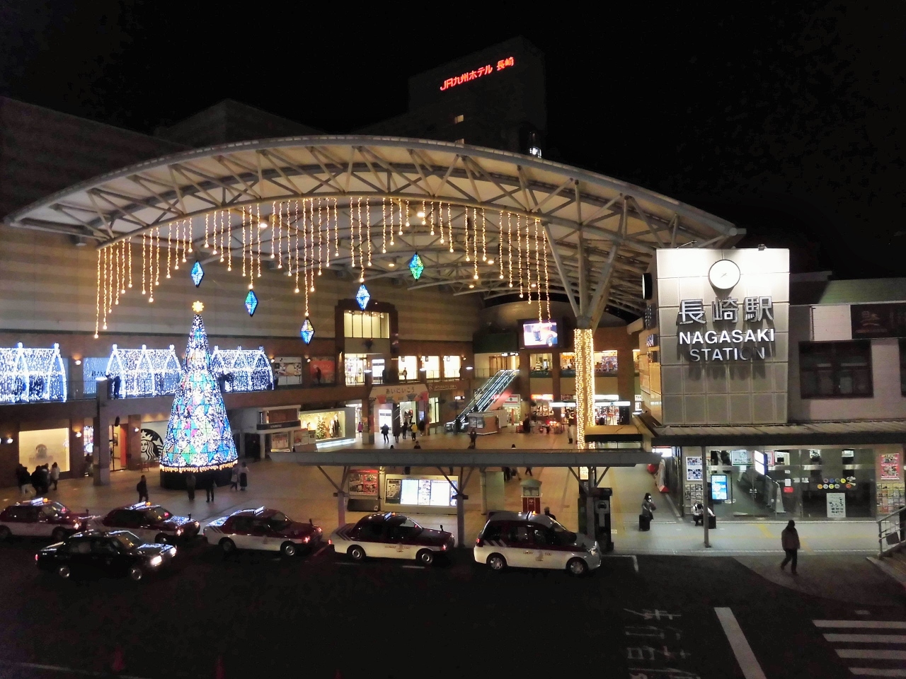 JRで長崎に行く時の終着駅です。駅前にはロータリーや駅直結のホテル、ショッピング街があり、また近くには路面電車の駅やバスセンターもあって、賑わっていました。クリスマスのイルミネーションが綺麗で目立っていました。