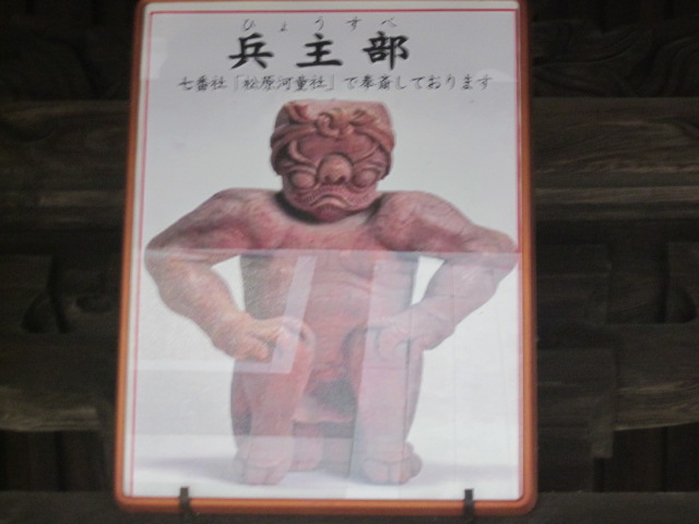 また、ここのユニークな”秘神”としては、河童がモチーフとなっている兵主部(ひょうすべ)と呼ばれる木像が安置されています。元々は社務所にいらしたそうですが、何年か前に全国各地の寺社で、秘仏などの盗難事故が相次いだことを受けて、新たに松原河童社を設けて、より懇ろに安置されるようになったとのことです。河童社の方で230年前の作という、力強い兵主部のお姿を拝むことが出来ます(勿論、撮影は禁止)ので、是非ご覧になってみて下さい。