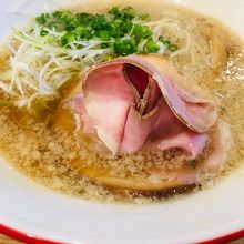 鷄、豚スープのほか、つけ麺や今回食べた背脂サバ煮干、その時々の限定などバラエティ豊か。チャーシューもレアと炙りの二種類乗っています。