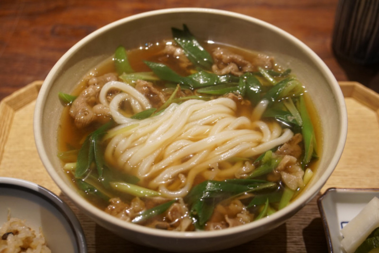 利尻昆布と5種類の削り節の出汁で、その旨味をかんじさせつつ薄口醤油によるくっきりした塩分が特徴的。一味、山椒、黒胡椒などが卓上に用意されますが、薬味を必要としないほどの強さがあります。京都らしい柔らかいうどんも出汁の恩恵をしっかりうける。出汁をすっていることもありますが、かなり熱々ではあるがすすって食べるとさらに一体感を増します。