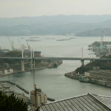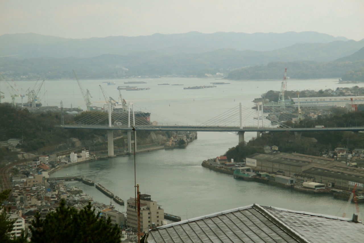 千光寺公園の展望台の上から尾道水道を眺めると、東端の方に2本の橋が重なって見えましたが、奥側が尾道路向島を結ぶ尾道大橋です。支柱が枠型で、手前の新尾道大橋が1本でシンプルなのに比べると頑丈そうに見えます。新尾道大橋の方は自動車専用道ですが、こちらは人の歩ける歩道もあります。
