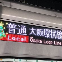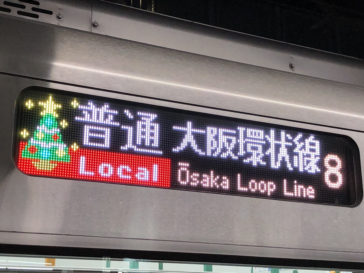 環状線の主役になっている323系電車は、表示機の「普通」の横に路線記号の「O」が表示はれていますが、毎年一本だけクリスマスツリーが表示される電車が登場します。