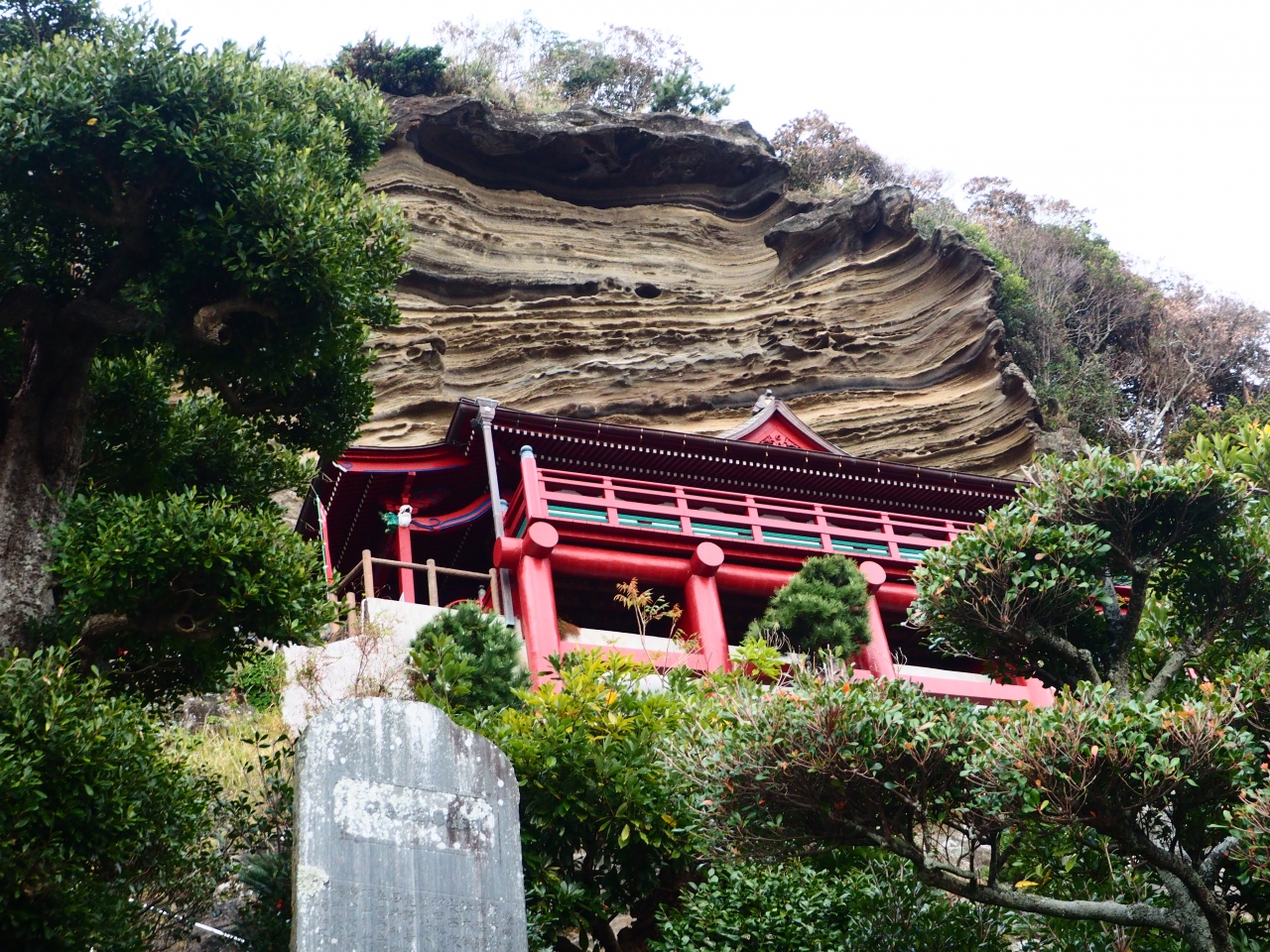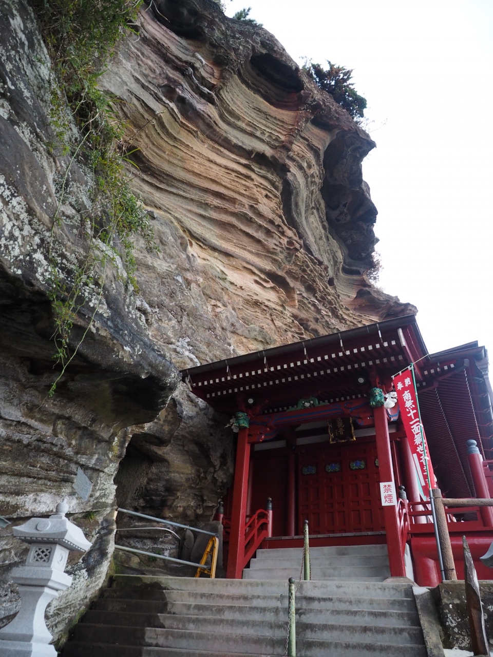 館山方面から千葉方面に続く県道を走っていると右側の切り立った山の中腹にへばりつくように建つ赤い祠が見えます。