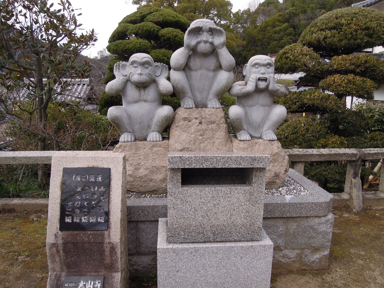 御袖天満宮に参拝して下山。疲れた足に鞭をいれて再び登ったのが、このお寺だ。境内についてびっくりしたが、すぐ横に天満宮の本殿が見えるではないか。このお寺は江戸時代まで天満宮の別当寺だったという。こんなことなら真横に異動すればよかった。隣接した庚申堂には「21世紀の新三猿像」が。「見ざる、言わざる、聞かざる」とは逆の「見てご猿、言うてご猿、聞いてご猿」との思いがこもっているという。「世の中の正しいことを<よく見よう><よく言おう><よく聞こう>」という意味らしい。帰途に就くと、石段の上からはるか千光寺まで尾道が別の角度で見渡せた。