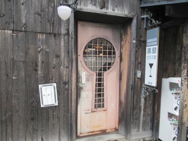 そのすぐ近くの黒壁ガラス館の裏口の扉は鍵の形の窓がユニークでした。