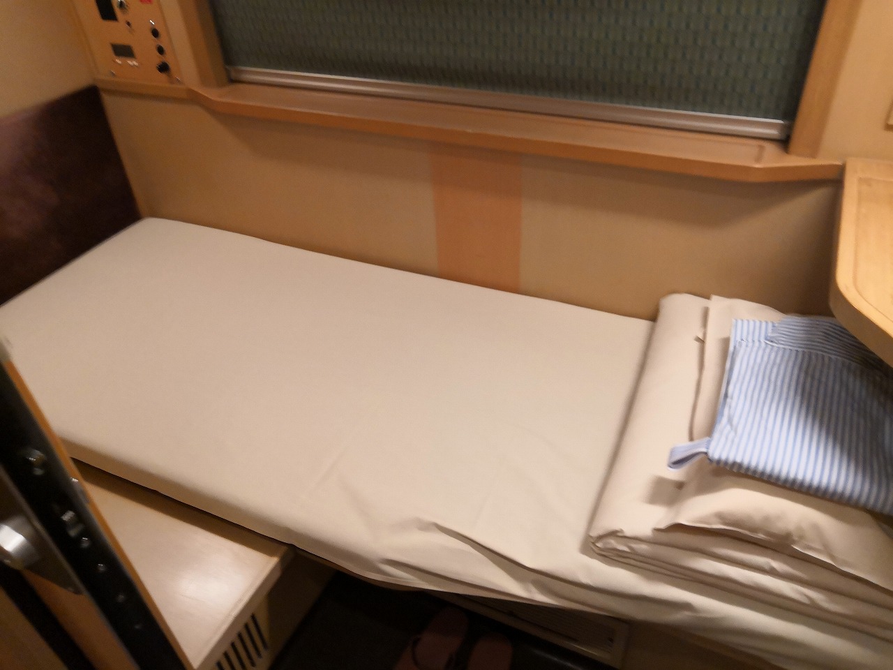 夜行バスよりも割高ですが国内唯一の寝台列車、サンライズ号を大阪から乗ってみました。ノビノビシートにしようかと思ったのですがシングルのB寝台個室が空いていたので思い切って個室にしました。個室も上段の方が車窓から眺めがよいです。料金は運賃8,750円+特急料金2,910円+寝台料金7,560円で夜行バスの約3倍でした。個室は快適でしたが列車の揺れであまり熟睡できず1日中眠かったです。
