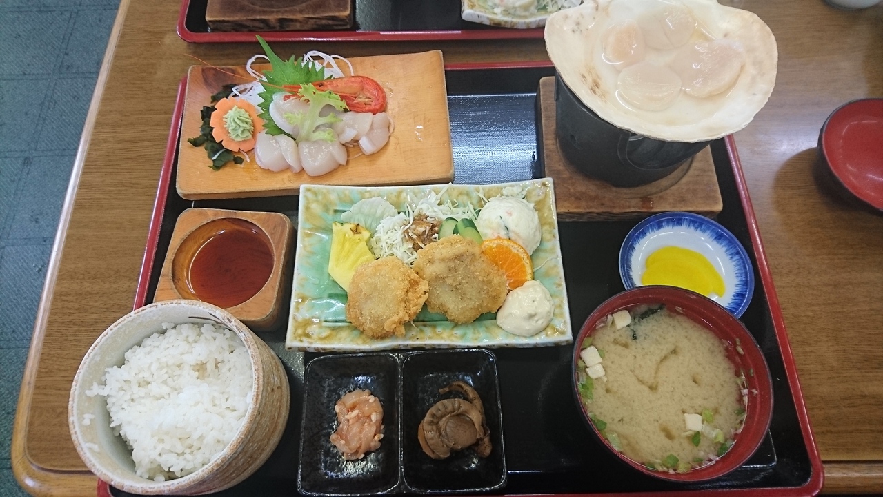 サロマ湖周辺をドライブ中にランチを頂きに。お客さんの出入りは頻繁だった。定食、丼もの、お寿司、そば、うどん、ラーメン、カレーとメニュー数は多い。一番人気のホタテ定食を注文。味噌汁にまでホタテが入っていて意外だった。牡蠣定食の味噌汁には牡蠣が入っていた。