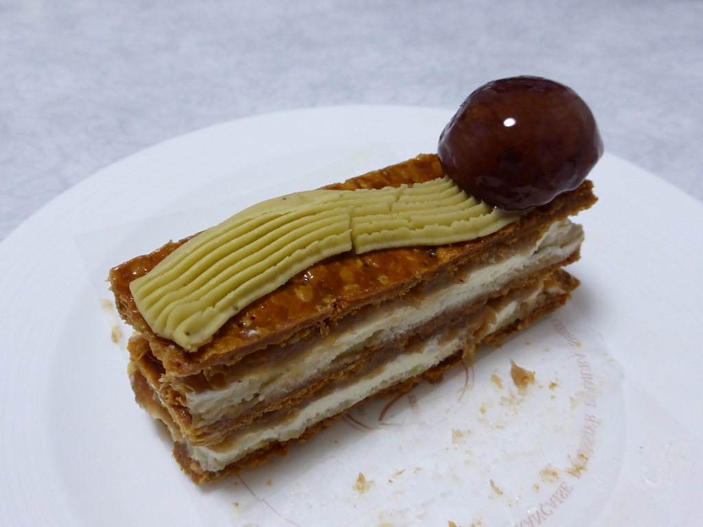 マロンのミルフィユ。パイ生地に厚みがあり香ばしい。中の栗のクリームと生クリームもまろやかで、パイ生地を合わさると食感もよくおいしさが増します。