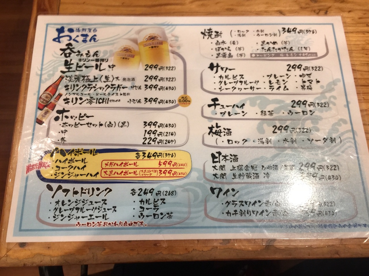 品川にしてはかなりリーズナブルです。麒麟一番搾り生中、麒麟淡麗生大が299円税別です。