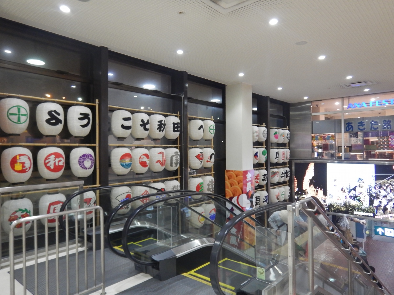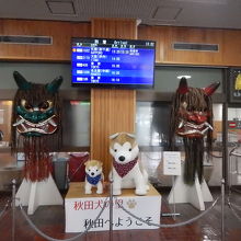 空港の到着ロビーではなまはげと秋田犬が出迎えてくれた。空港自体は1日20往復程度の飛行機しか飛んでいないので、こじんまりとしたものだった。空港内にはコンビニやレストラン、土産物店がある。秋田の土産というと日本酒だろうか。出発ロビーには竿灯の提灯が飾ってあったのも秋田らしかった。