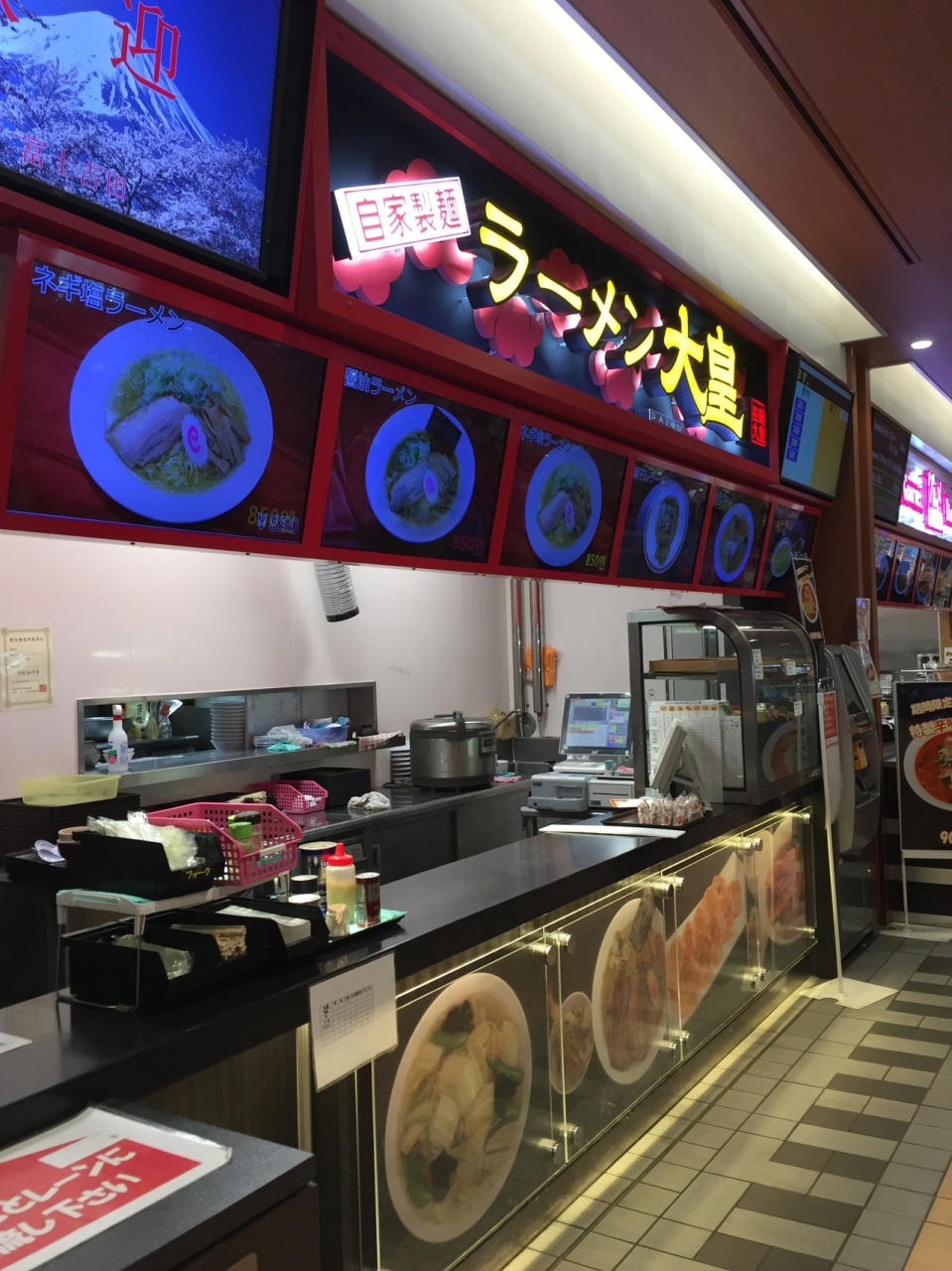 中央高速道路利用時はいつも 早朝から夜なので 大渋滞中で なかなか談合坂サービスエリアに寄る機会が無いのですが、平日の14時頃に寄ってみたら ガラガラで空いてました。ラーメンを頂く事に。ラーメンは800円から~ 券売機で券を購入してカウンターで受け取ります。
