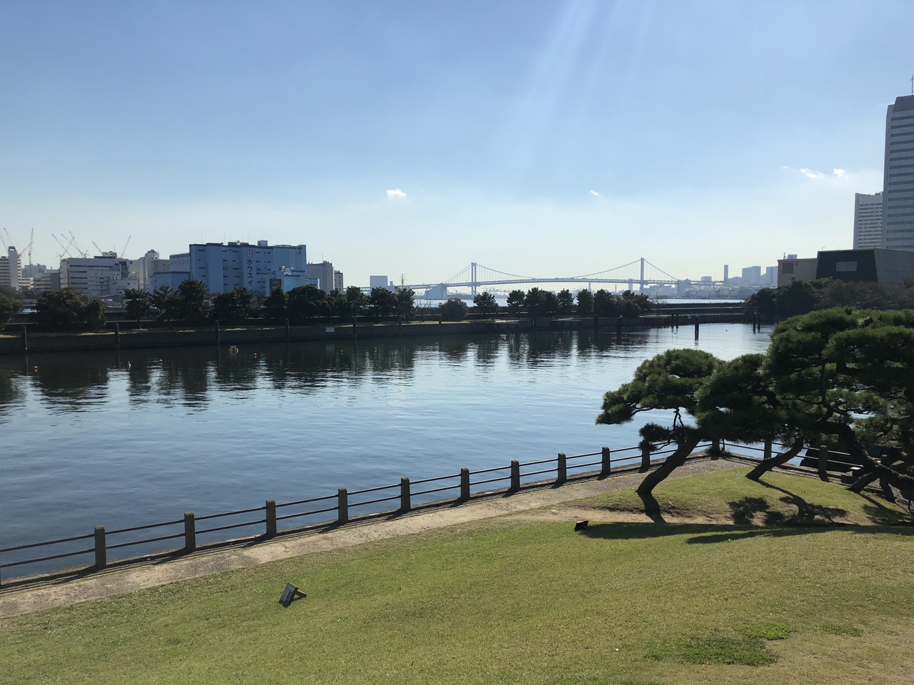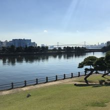 浜離宮庭園の東京湾川、横堀水門を挟んで樋の口山と新樋の口山があり、新樋ノ口山のほうからはレインボーブリッジなどの美しい景色が良く見えます。