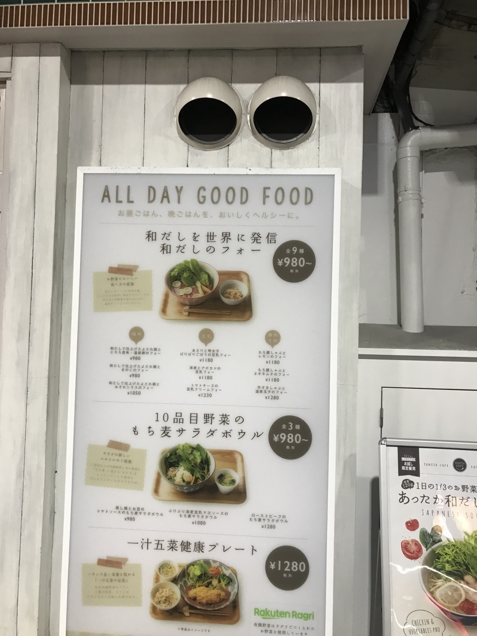 有楽町駅高架下に出来た、体重計のタニタのカフェになります。身体に優しいカロリーの低いフォーや、10品目にもち麦を使ったどんぶりなど野菜もたくさん摂りながらもヘルシーなメニューが中心で、人気があります。