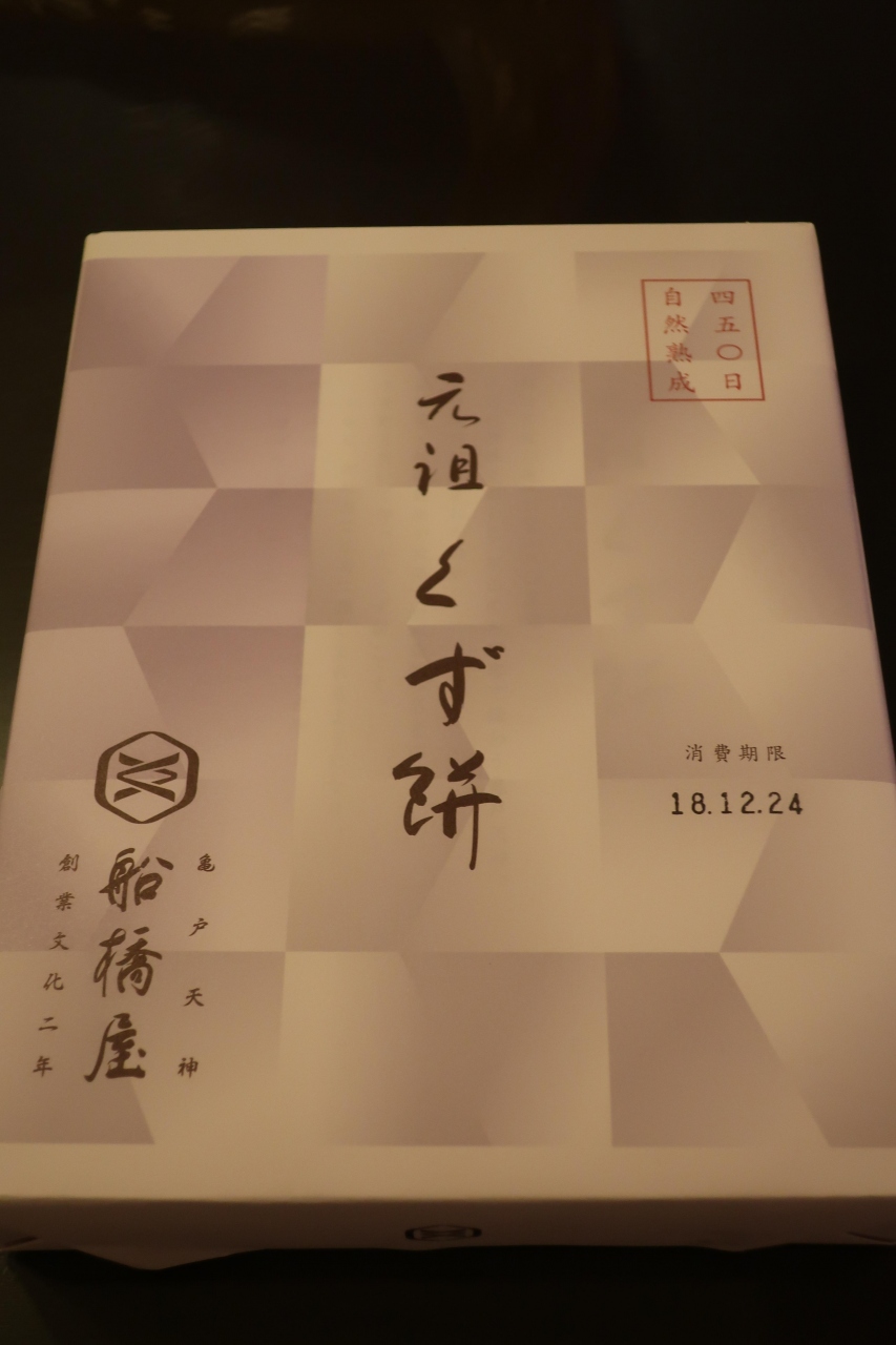 コレド室町の1階、中央通りの反対側に船橋屋はあります。くず餅が有名なお店ですが、デパートに入っている船橋屋の店舗では食べることが出来ませんが、こちらの店舗にはイートインのテーブルがあり店内でくず餅を頂くことができます。しかし、テーブルは少なく待つこと必須。私も店内で食べたかったのですが、入店待ちの人が5組おり、時間が掛かりそうでしたので、仕方なく買って帰り家で頂きました。ぷるぷるしたくず餅はきな粉、黒蜜と絶妙の味。和菓子で一番好きかもしれせん。