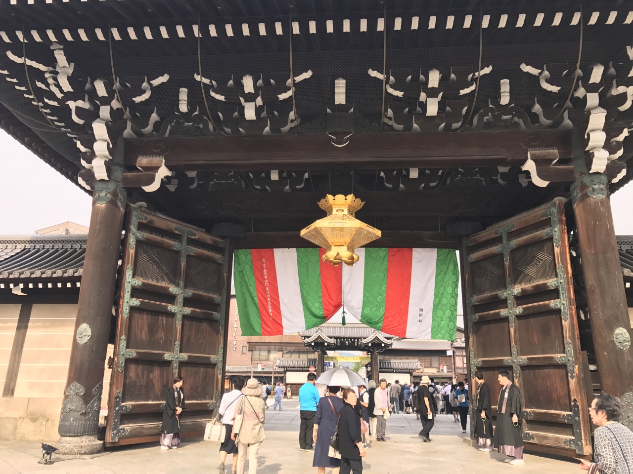 春の法要時に訪問。垂れ幕がかけられ、住職の方々が門の前に立ってお見送りしてくれました。人が立っていると門がいかに大きいのか良くわかります。西本本願寺の出入り口になっている門なので、周辺は沢山の人でした。門から見えるs能登景色がいい感じです。