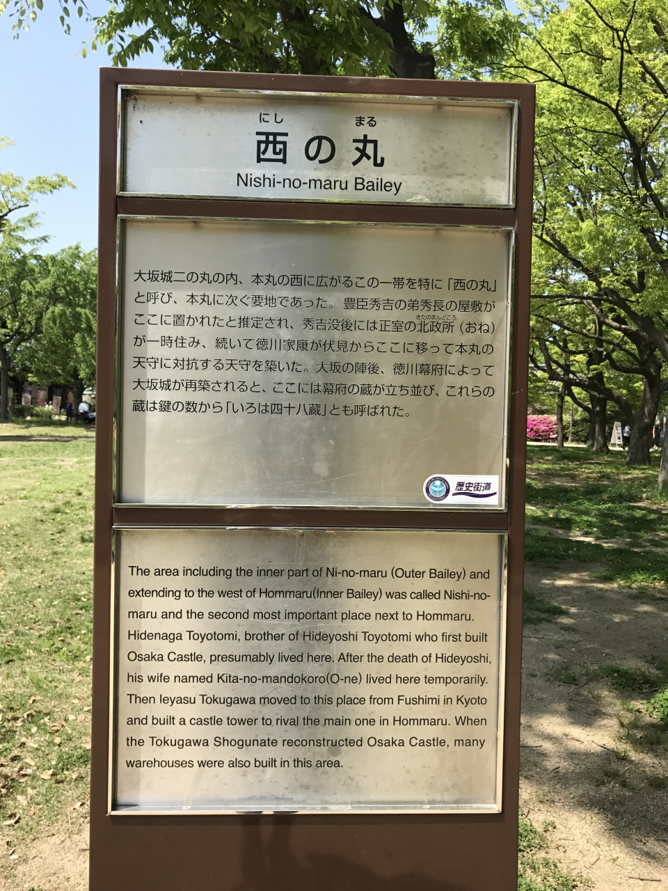 一面、芝生が広がる西の丸公園です。公園からは大阪城が良く見えて景観が良いです。ビニールシートを敷いて飲食をしている日ともいたので、いろいろ楽しみ方がありそうです。4月の訪問でしたが、緑が生い茂っていて、整備された新緑の公園という感じでした。たまにここでイベントが開催されるらしいので、チェックしてみようと思います。