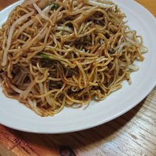 くるめりあの裏付近にあるお店です。焼きそばが名物とのこと。2人分を注文すると、1つの皿に盛られて、提供されました。大人数で行っても、取り皿で分けて食べることができます。細麺で食べやすい。パリパリの食感の部分も最高です。