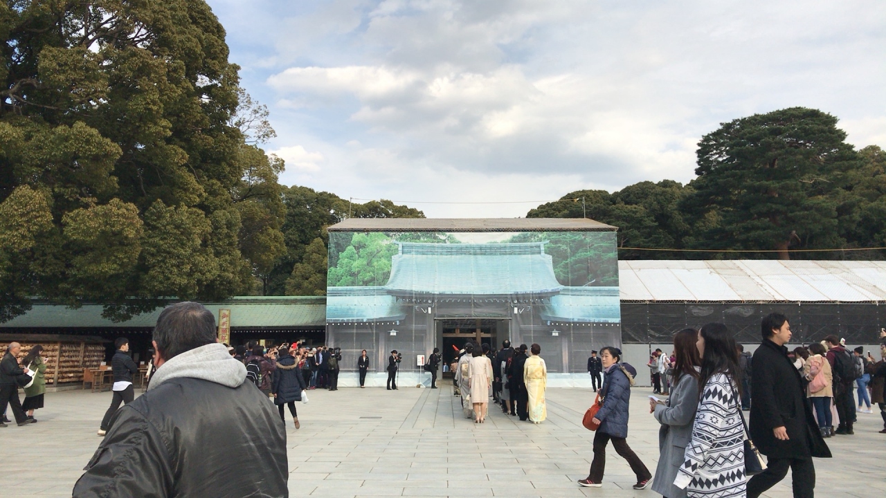 平日に訪問したにも関わらず、偶然、結婚式を見ることができました。平日と言っても観光客が沢山いたので、みんな立ち止まって、他人の結婚式の写真を撮っていました。明治神宮の結婚式っ良いですね。きれいな花嫁さんでした。門の部分が改装中で張りぼてだったのは、残念ですね。