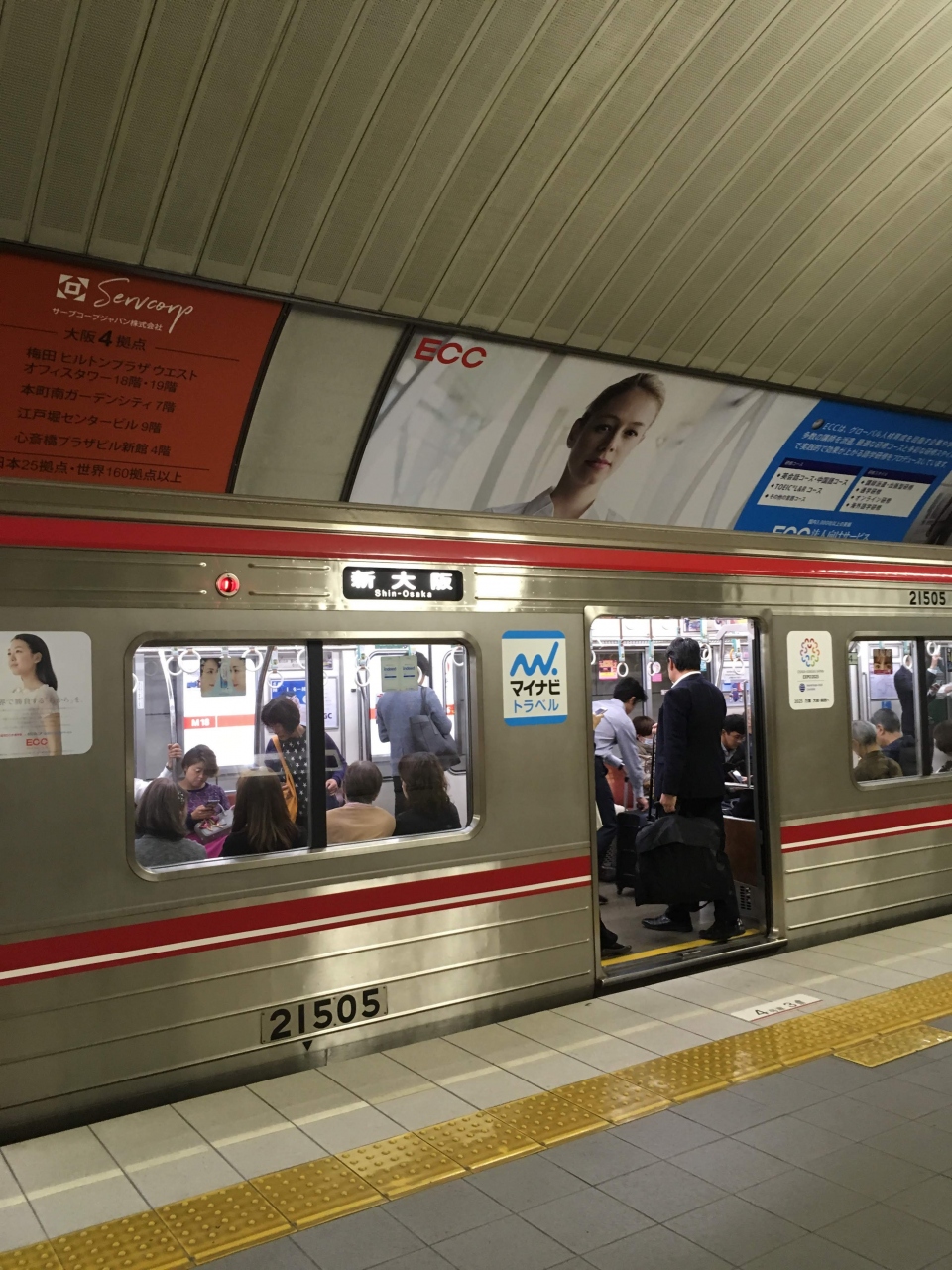 大阪市営地下鉄の稼ぎ頭の御堂筋線。混雑はよその街の地下鉄以上に混雑しています。本数も多いので、非常に便利です。行き先は通しでなく、新大阪止まりの電車もよくあります。また、大阪の主要な繁華街をほぼすべて網羅しているので、宿泊先などを決めるときは御堂筋線沿いにすると非常に便利です。