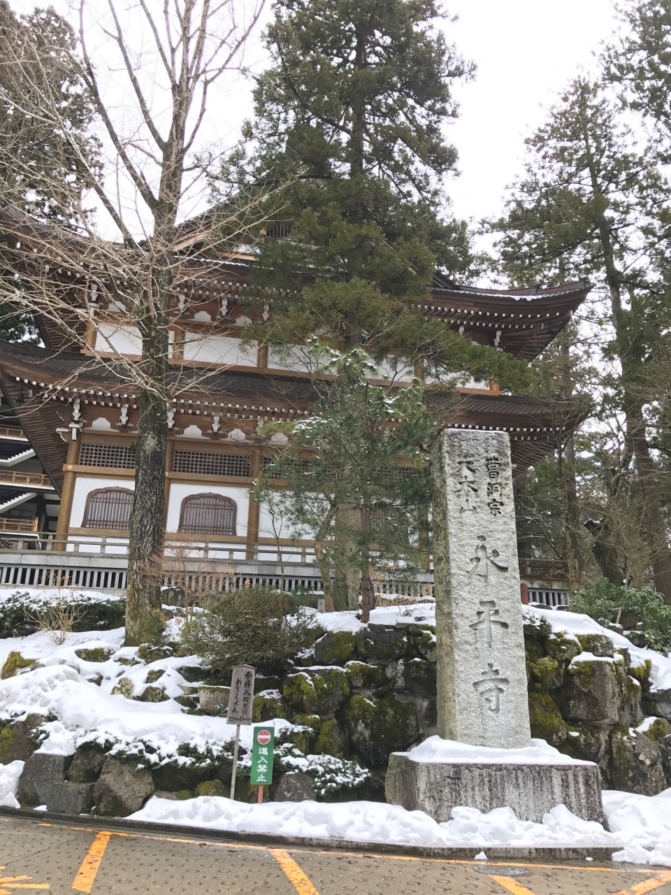 永平寺の御朱印を頼まれ訪問しました。雪が積もっていて寒かったです。スリッパも貸してくれますが、サイズが大きめで滑りやすかった。観光客はガラガラで、寺院内を見学する前に、頼んでないけど別室で座禅の仕方を教えてくれた。前回訪れたときは、そういった座禅の仕方はなかったので、やるときとやらない時があるんでしょうか。