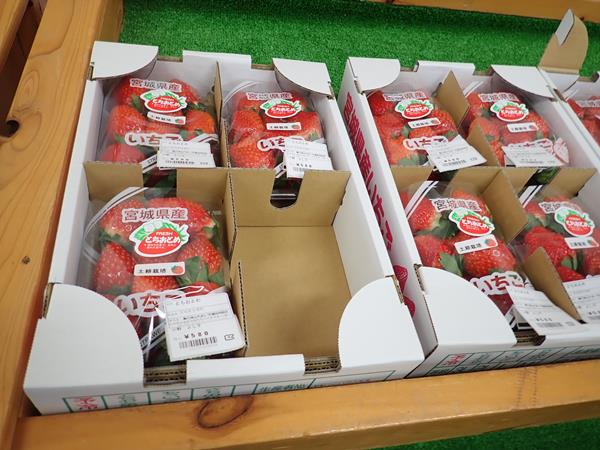 亘理町の地元産品がそろう市場。いちごと加工製品も