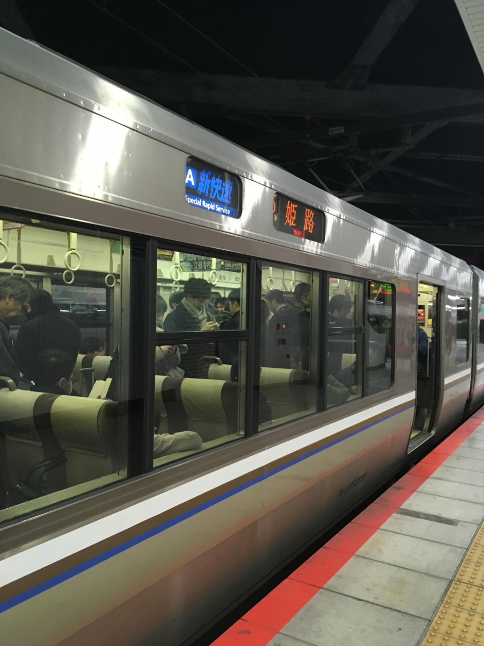 JR神戸線、京都線と通しで運行していることが多い新快速。大阪、京都、神戸、姫路といった主要都市を最短時間で結んでいますし、運行頻度も高いので旅行者でも乗りやすい電車です。路線などもまったく違うので比較にはなりませんが、正直関東にはないスタイルの電車だなと思いました。